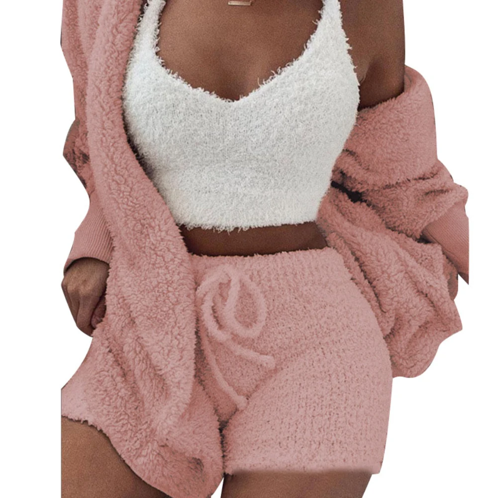 3 шт. Женский Осенний плюшевый укороченный топ, пальто с длинным рукавом, костюм с шортами на завязках