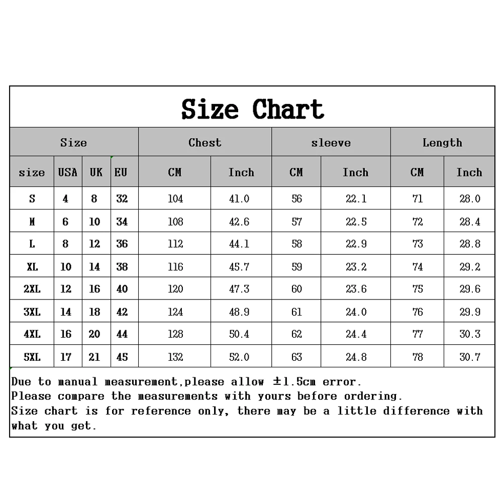 [Наш Размер 5XL] Обхват груди: 132 см/51,97 дюйма, длина: 78 см/30,71 дюйма, длина рукава: 63 см/24,80 дюйма (прибл.)