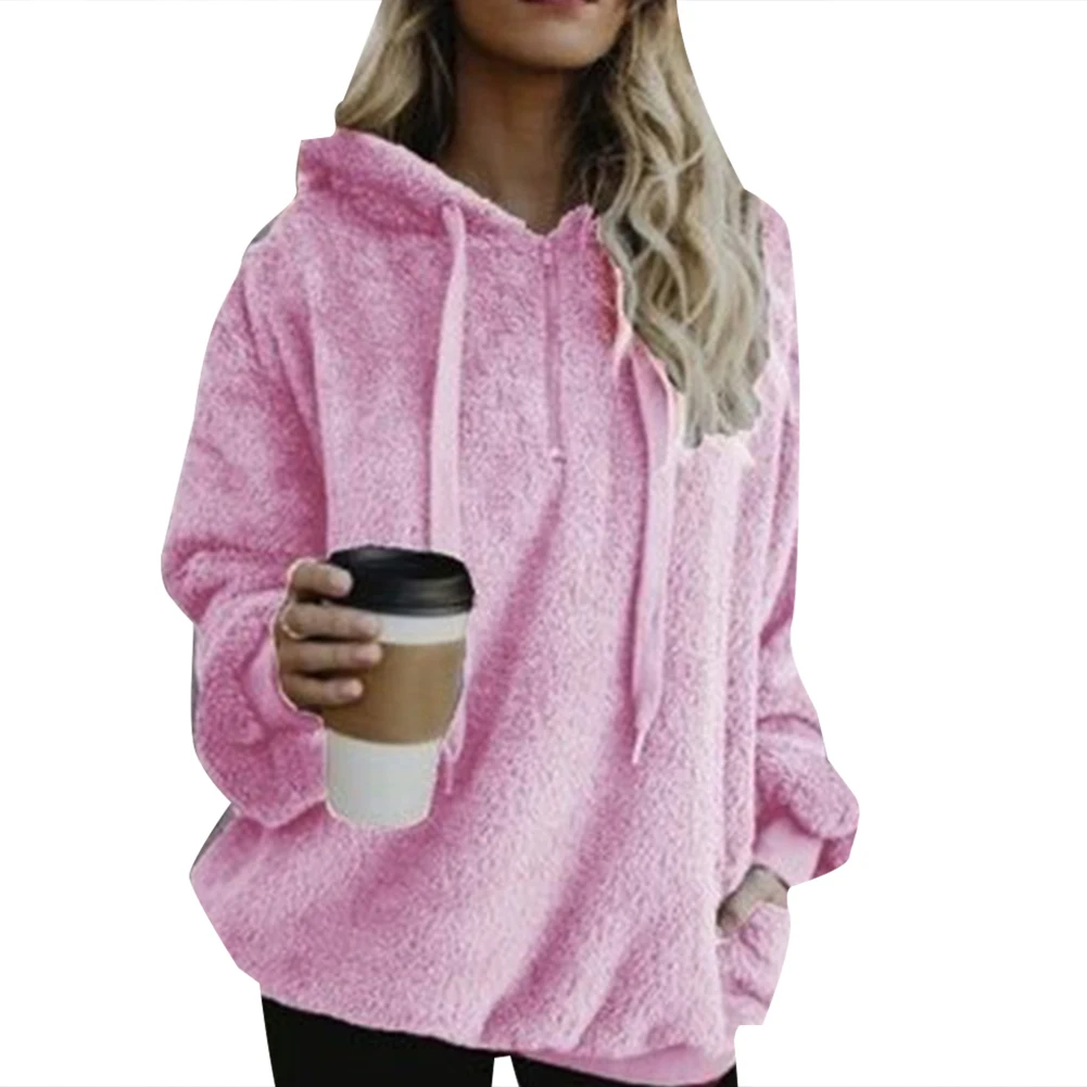 Зимние одноцветные пушистые толстовки на молнии 1/4 размера плюс, Женская толстовка с капюшоном