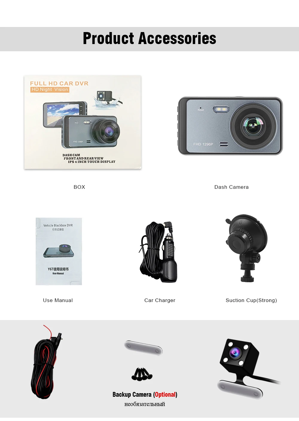 • 1 автомобильная камера • Крепление камеры-1 шт. • Автомобильное зарядное устройство-1 шт. • Руководство пользователя на английском языке-1 шт. • 1 задняя камера с кабелем (опционально)