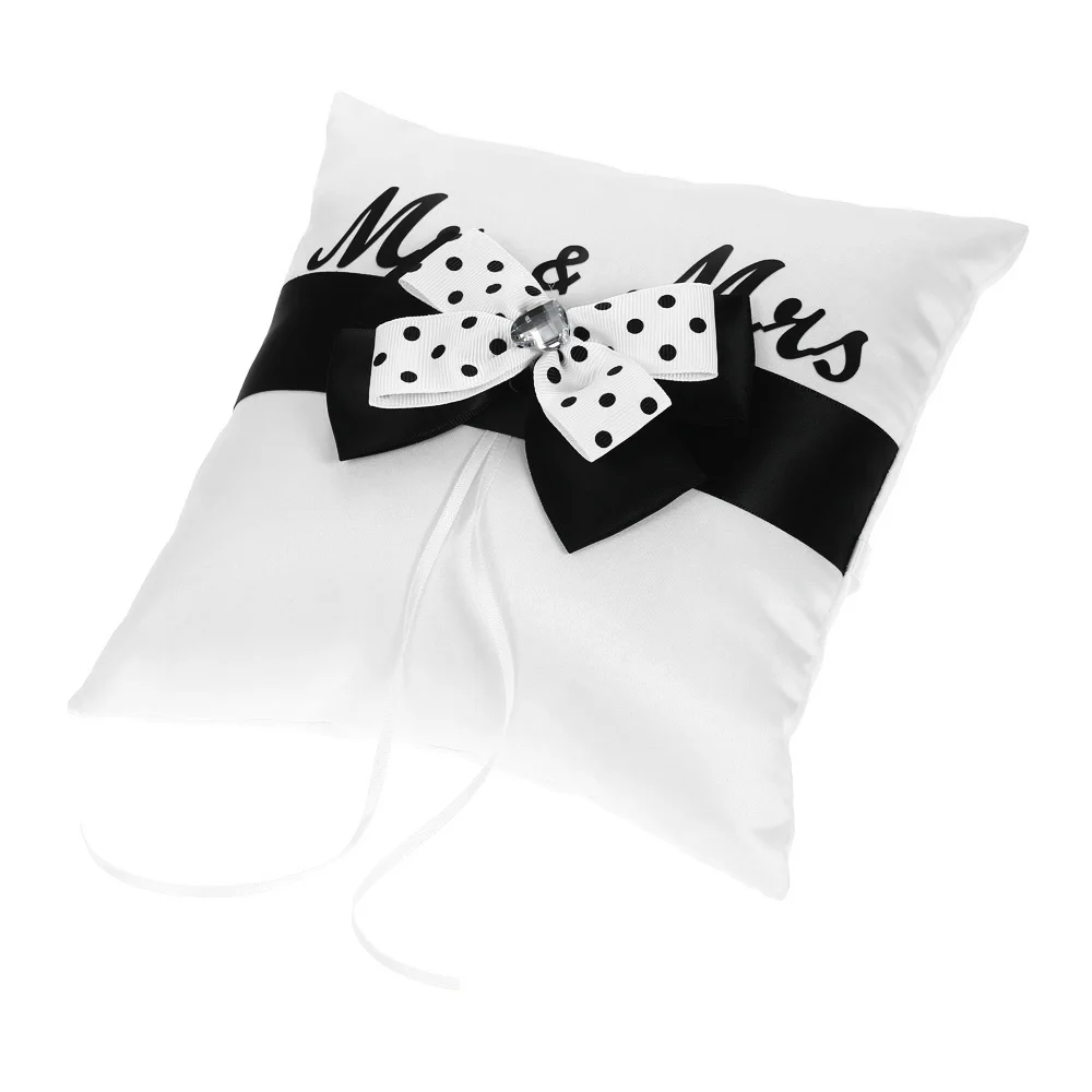Атласная Подушка-кольцо, украшенная белым и черным бантом и надписью «Mr & Mrs», идеально подходит для вашей свадьбы! Он гладкий и выглядит элегантно, отличный выбор!