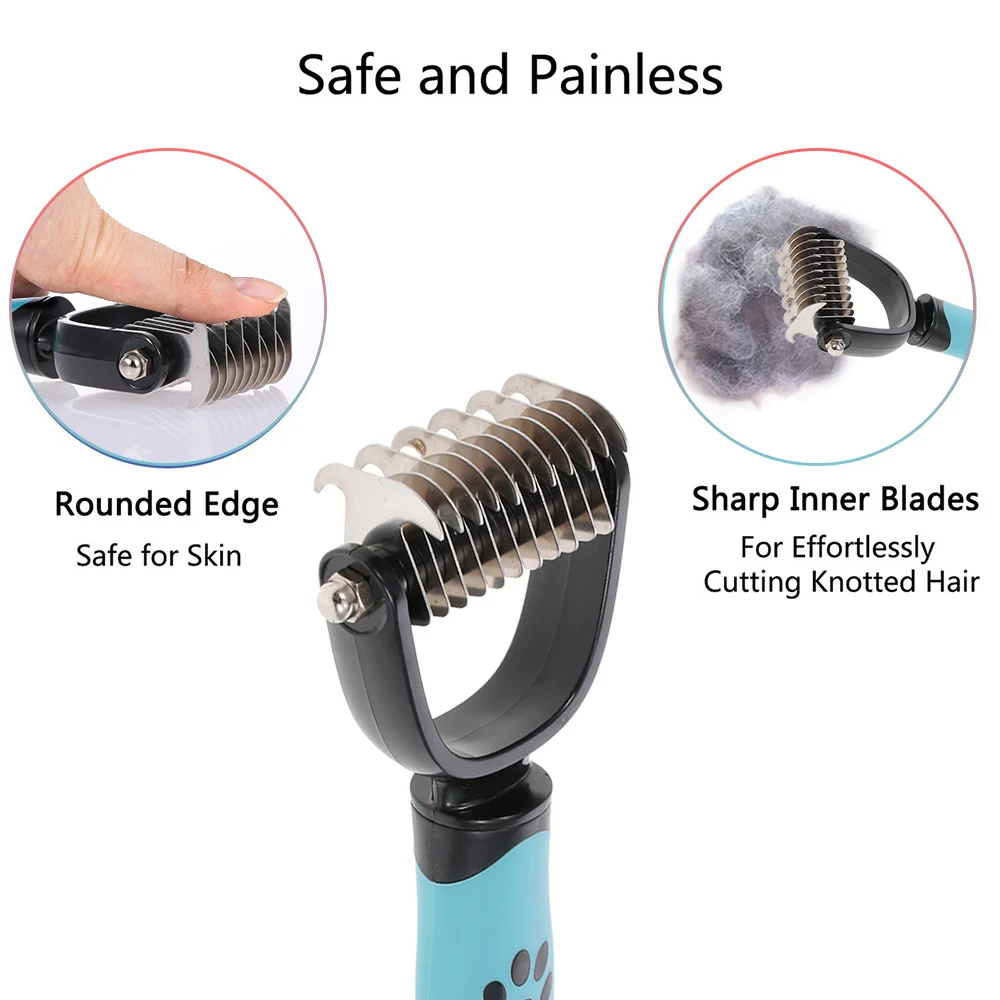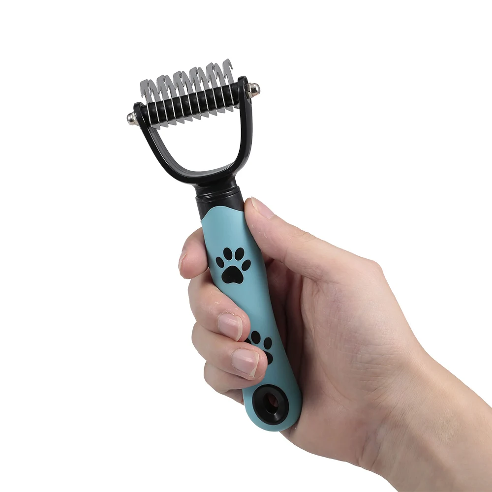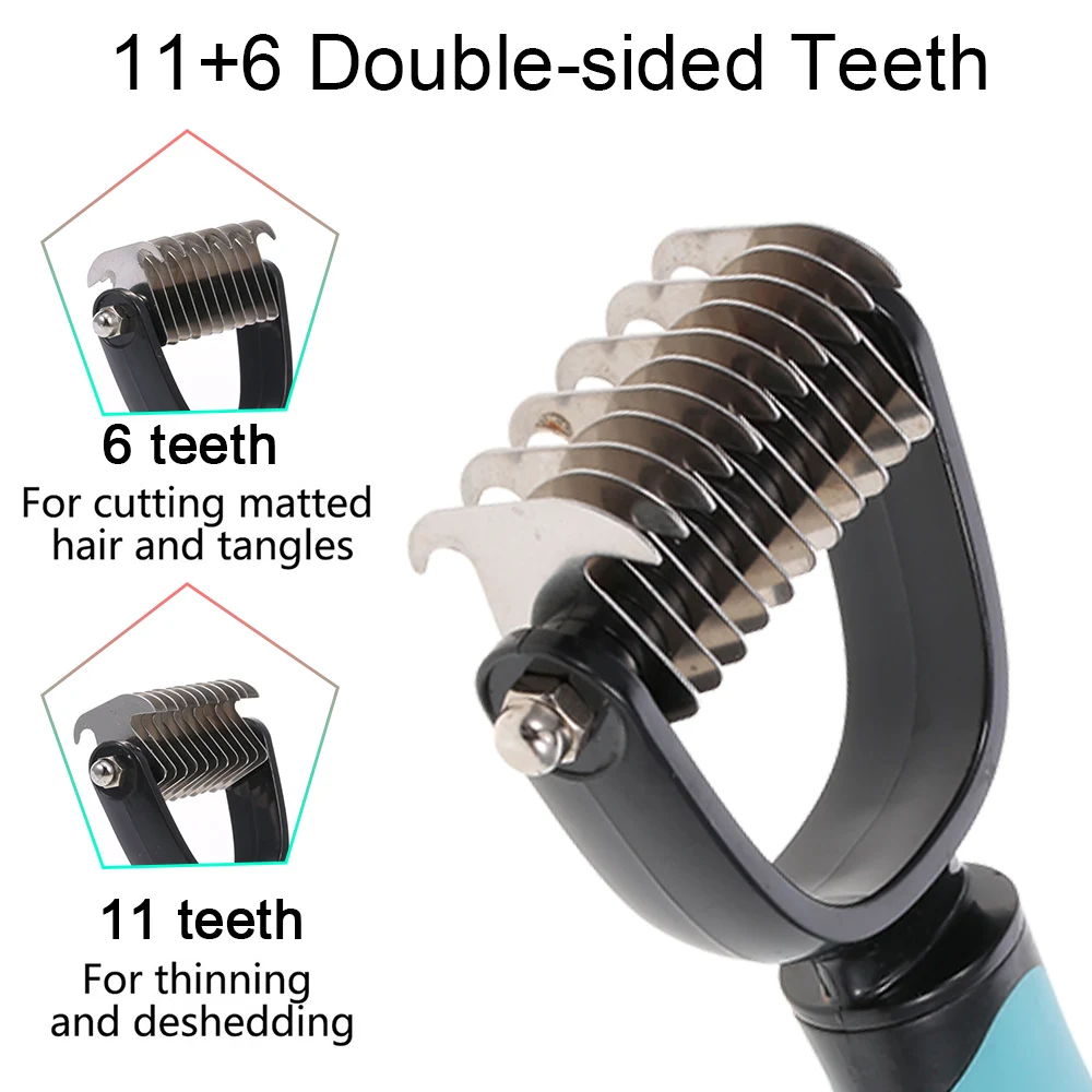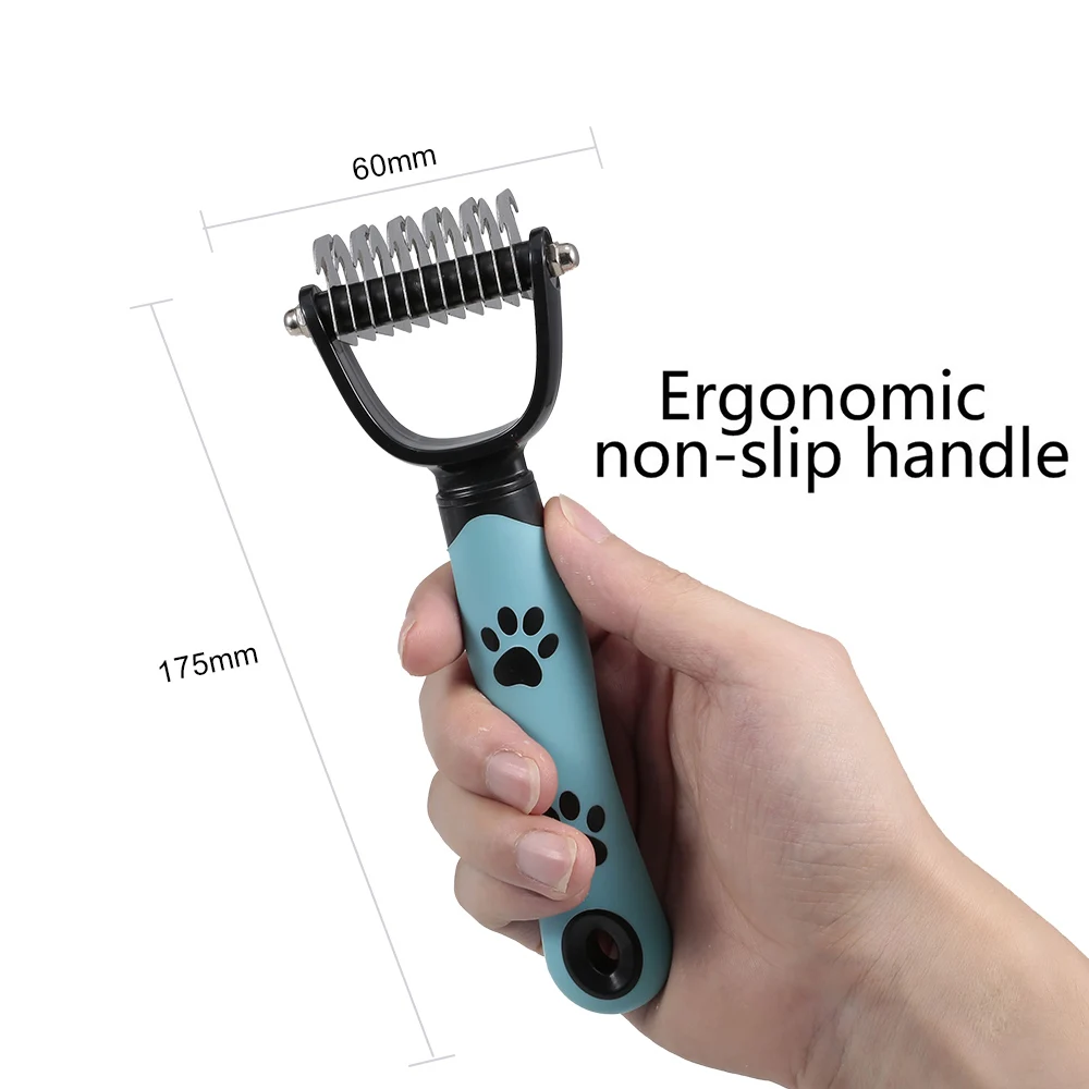 Двухсторонний дизайн зубов: начните с 6 зубьев для упорных ковриков иЗапутывает и завершает с 11 зубьями стороны для истончения и deshedding, достичь более быстрого и профессионального dematting и ухода результатов!