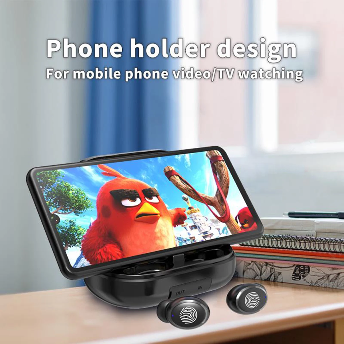 The charging box also can be used as a phone holder and a power bank