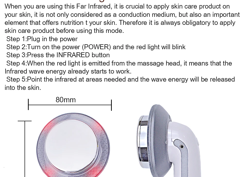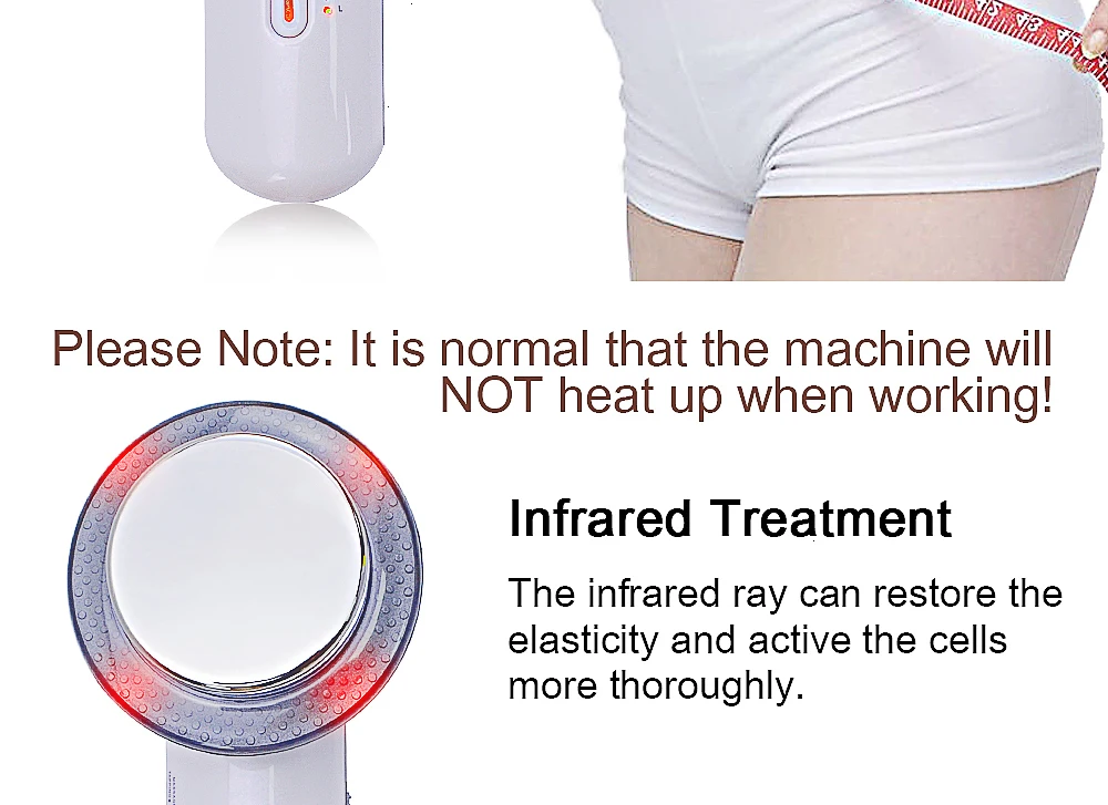 Параметры: Мощность Адаптера: AC100-240V Для адаптера переменного тока Выходная мощность: 15 Вт, 800mA Ультразвуковая частота: 1 МГц Посылка Вес: 0,713 кг Размер продукта (Д x Ш x В): 19,00x8,00x6,00 см/7,48x3,15x2,36 дюймов Размер посылка (Д x Ш x В): 25,00x18,00x7,50 см/9,84x7,09x2,95 дюймов Посылка: 1 косметическая машина, 1 электрод, 1 кабель питания Технология: EMS + инфракрасный + Ультразвуковой Ультразвуковой волновой массаж может не растерять жир и не стягивать кожу. Intrared луч может вернуть эластичность и активнее клетки. 5 режимов EMS (постукивание, массаж, разминание, скрапывание, похудение), 5 режимов интенсивности выбора, свободный выбор позволит вам чувствовать себя комфортно. Примечание: ультразвуковая волна и Дальний инфракрасный свет вызовут теплое ощущение для вашей кожи, это нормальное явление, пожалуйста, используйте с легкостью. Параметры: 1. Дальняя инфракрасная область имеет следующие функции: Связка из углеродного волокна, окружающая зонд, может генерировать Дальний инфракрасный луч с длиной волны 8 -12μm. Он может проникать в глубину кожи, усиливать энергию кожи, активировать клетки и ускорать обмен веществ. 2. Ультразвуковой имеет три основные функции: Он может изменить емкость и движение каждой клетки с точной функцией массажа, которая называется как Клетками массажа. Он может стимулировать и регулировать цитомембрану, увеличить проницаемость эпидермиса, его Тепловое, физическое и химическое воздействие может повысить температуру в глубокой коже на 0,5-1 °C, способствует поглощению кожи Эссенции, ускоряют метаболизм и усиливают регенеративный ход ткани. Ультразвуковой также может Разлагают отходы, окружающие жир, потребляют энергию, восстанавливают лимфатические и капиллярные сосуды с потерей веса И функции скульптуры фигуры. 3. Микроток: Массаж с микротоком, стимулирует мышцы пассивным движением при токе. Мышечное движение Потребляет жир, сахар и углеводы окружающей ткани. При нормальном движении мышца может потреблять 60-70 Дж энергии в секунду, но при высокочастотном движении, мышцы могут потреблять 3000-4000 Дж Energy в секунду. Примечание: он не может нагреваться. Нагревается только инфракрасная лучевая часть, ультразвуковая Массажная часть без функции тепла. 1. После того, как ультразвуковая функция включена в течение нескольких минут, коснитесь поверхности массажной головки без явного тепла. Это доказательство того, что прибор имеет хорошую производительность и потеря тепла детали низкая. 2. Он использует 10 углеродных волокон в качестве источника тепла для генерации естественных инфракрасных лучей. Инфракрасные облученные клетки резонируют и втирают, генерируя тепловую реакцию и ускоряя разложение жира. Светильник EMS режима не включается при нажатии кнопки sonic mode. EMS обработаны липкими электродными подушечками. И нет режима при регулировке кнопки выбора режима в нижней части, нет интенсивности при регулировке клавиши выбора интенсивности в нижней части. Обратите внимание на это. Звуковой режим (нет режима Ems на этот раз) не нужны колодки. Если вы хотите регулировать секрецию и повысить потребление жира, вам нужно EMS. Если вы хотите сделать массаж для похудения и ухода за кожей, вам нужна звуковая система. Это важно для режима EMS, он перестанет работать автоматически через 10 минут, если вы хотите повторять нужно включить его снова.