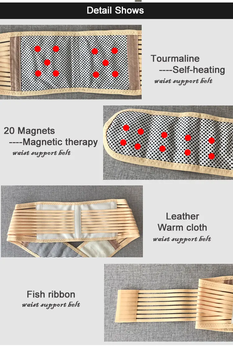 1. Изготовлен из высококачественного эластичного нейлона вместе с искусственной кожей из ПВХ, Высококачественная растягивающаяся ткань для лески, турмалиновая ткань и магнитные камни. 2. Волшебные наклейки для удобства ношения, чтобы эффективно поддерживать шейный отдел позвоночника в нормальном положении 3. Снимает боли и сдавливание при мышечных травмах и общей дисфункции нижней части спины, травмах поясничных дисков и дисфункции сустационного сустава 4. Бандаж имеет дополнительную турмалиновую ткань и магнитные камни спереди, чтобы помочь облегчить боль в животе и может помочь обрезать жир живота и похудеть вашу талию.