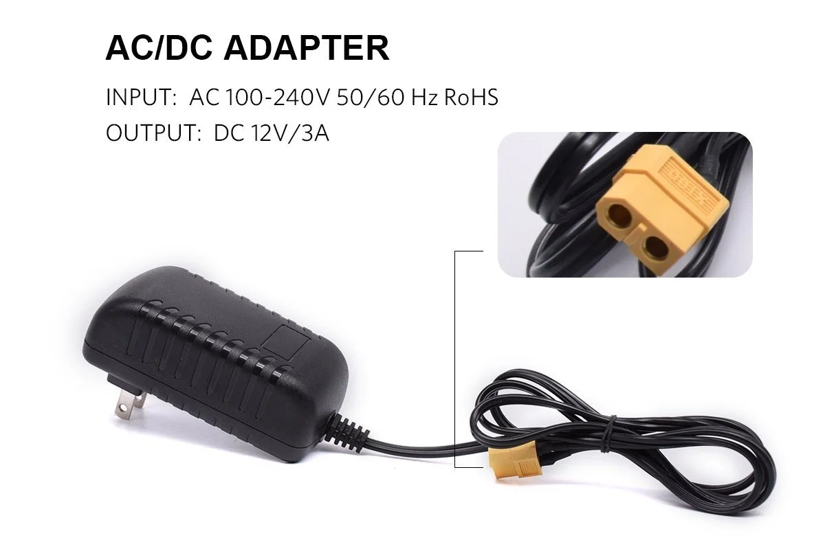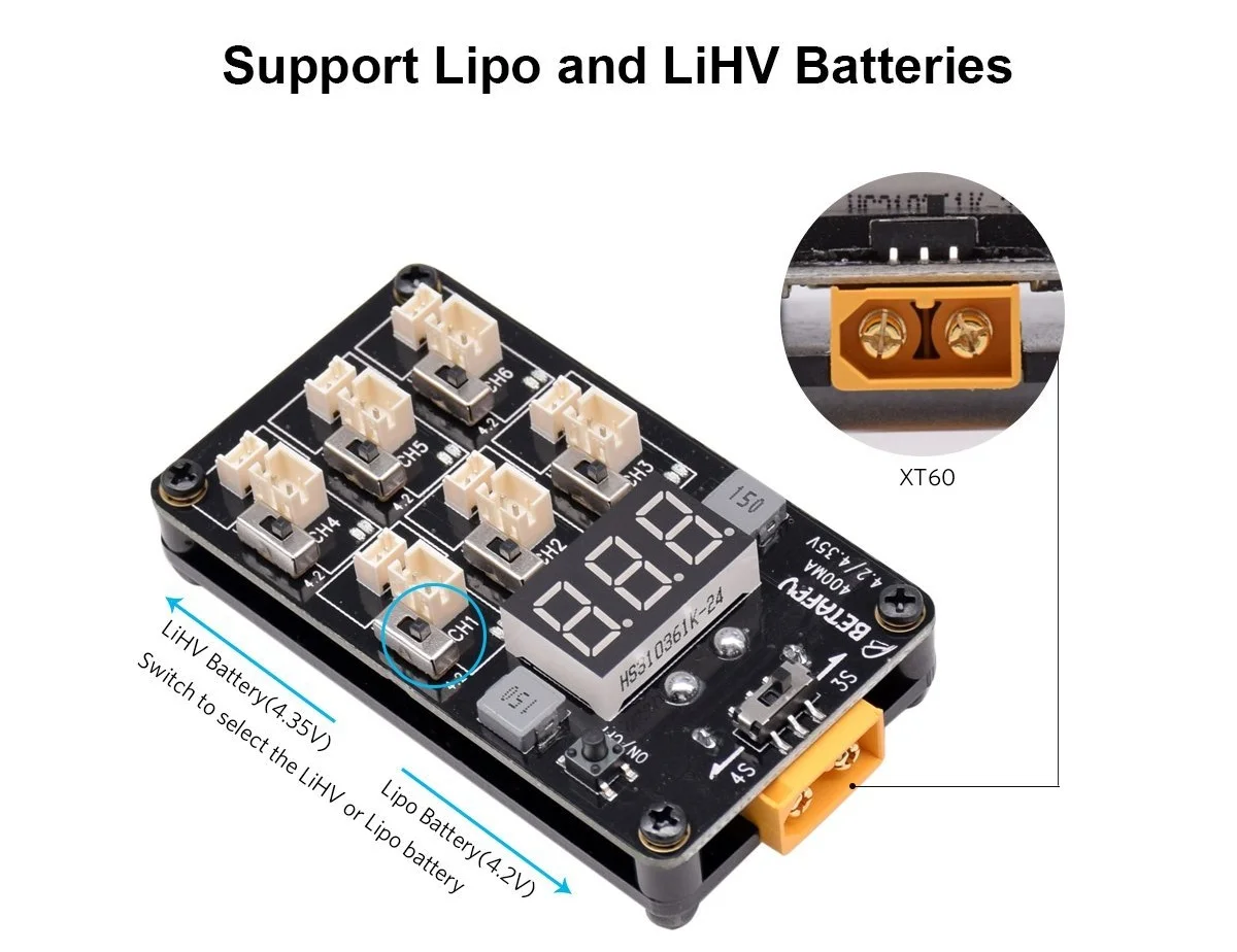 Описание товара: Это зарядное устройство позволяет легко заряжать модель самолета, дрона или квадрокоптера! Просто используйте 3s или 4s lipo с штепсельной вилкой XT60 (коннектором), затем подключите его к этому зарядному устройству и зарядите 12 батарей 1s. Вы также можете использовать настенный адаптер в качестве источника питания, чтобы вы могли непрерывно заряжать дома. Как только аккумулятор 3s или 4s доступен, просто подключите аккумулятор 1s к зарядному устройству и начните зарядку. Когда вы подключаете разряженный аккумулятор 1s к зарядному устройству, соответствующий светодиодный порт станет красным, пока аккумулятор не будет полностью заряжен. После зарядки светодиодный индикатор будет зеленым, и вы сможете снять аккумулятор 1s и полететь! Руководство по эксплуатации: 1. Заряжайте литиевую батарею 1S (4,2 В) и литиевую батарею HV (4,35 в) на одной и той же плате с выбираемыми переключателями. 2. Вход XT60 (3s или 4s) для зарядки на месте. До 6 батарей можно заряжать одновременно с помощью вилки питания picoblad 1,25 или JST PH2.0. Каждый порт заряжается отдельно, а не параллельно. 3. Аккумулятор питания автоматически отключается, когда он достигает безопасного низкого напряжения. 2-канальный BEC используется для подачи тока. Ток 400 мА · ч на порт зарядки. 4. Светодиодный индикатор показывает, когда каждая батарея полностью заряжена. Параметры продукта: Вес: 36 г Размер: 75x42x17мм Вход: 3s - 4s опционально Напряжение отключения: 10,8 В (3s), 14,4 В (4s) Выход: фиксируется приблизительно на 400 мА Батарейка Lipo 4,20 в, отсек заряда батареи (+ - 0.5% диапазон ошибок) 4,35 в отсек заряда батареи для HV Lipo батарей (± 0.5% диапазон ошибок) Дополнительный настенный адаптер переменного тока Примечание: Номер порта 1-6. Не размещайте больше одного аккумулятора на одном порту. Например: не вставляйте аккумулятор в вилку picoblad 1,25, а вставьте другой аккумулятор в том же порту вилки PH 2,0. Спецификация упаковки: 1 шт. * зарядное устройство 1 шт. * адаптер 1 шт. * зарядное устройство + адаптер