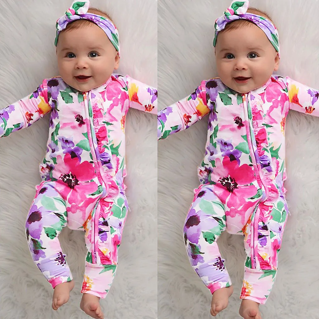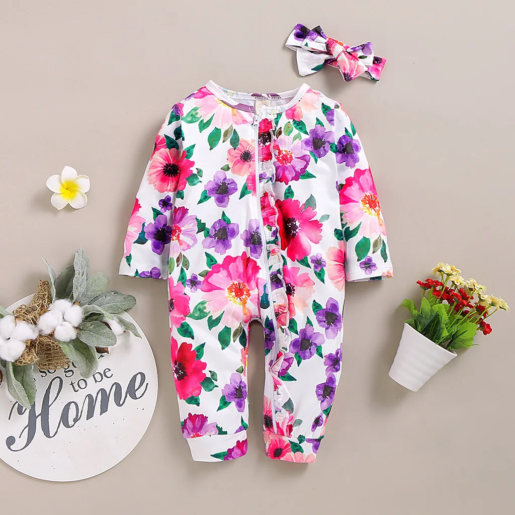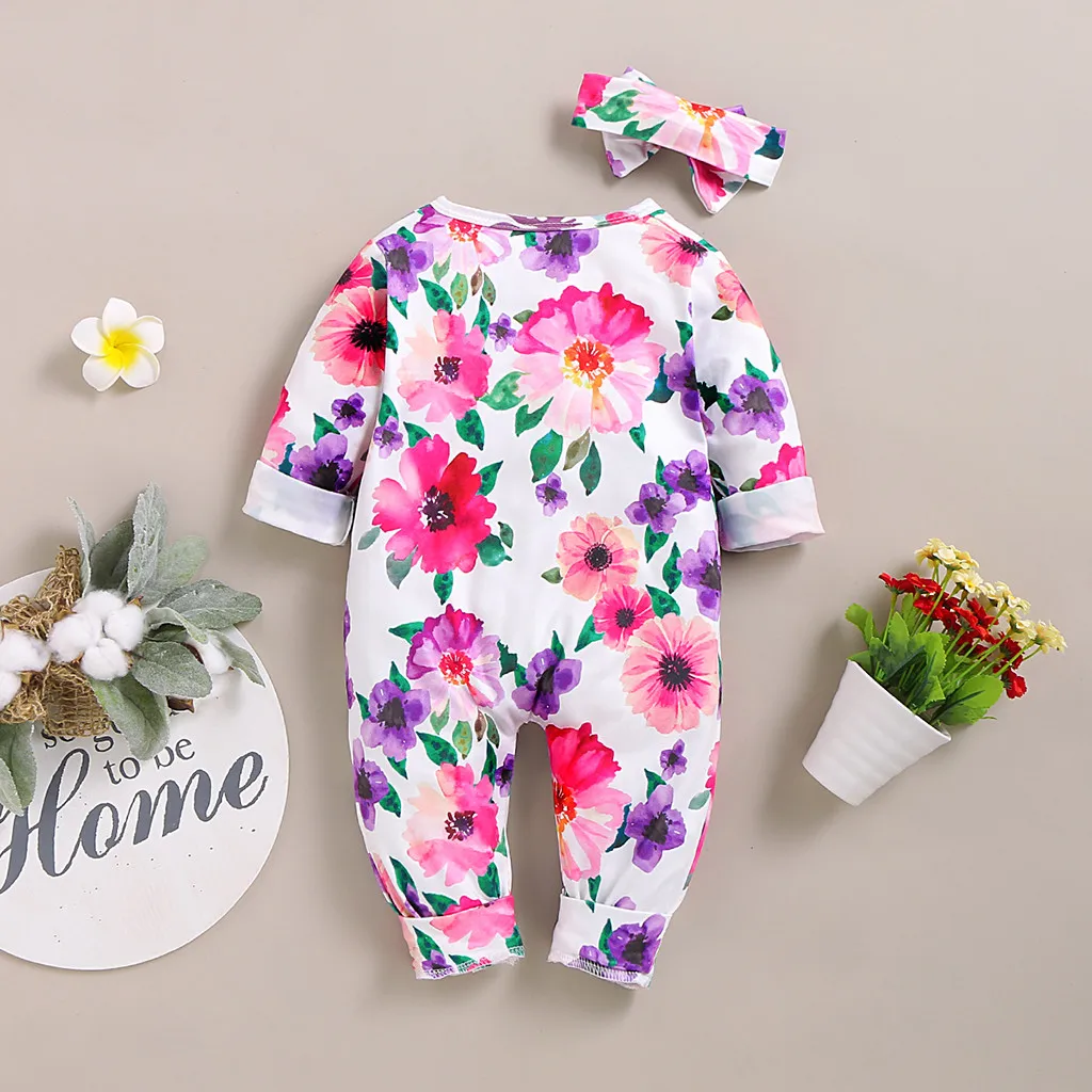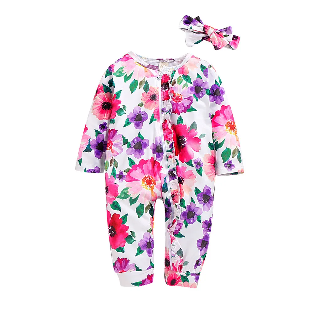Детский комбинезон с длинным рукавом и цветочным принтом для мальчиков и девочек + повязка на голову