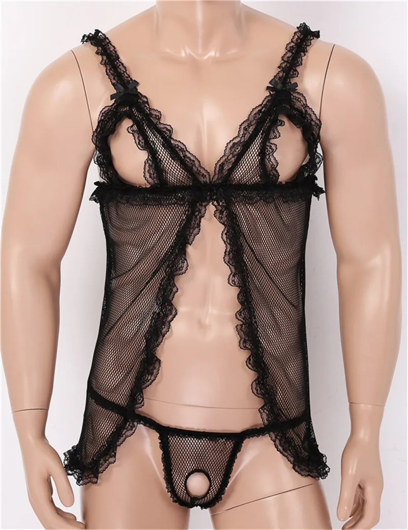 Мужской кружевной комплект нижнего белья, прозрачная в крупную сетку.