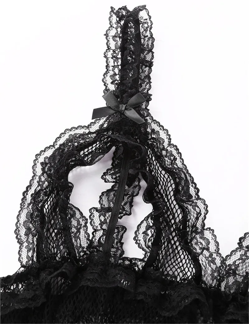 Эластичные плечевые ремни и грудь для удобной посадки, открытые чашечки и дизайн с разрезом спереди, отделанные кружевом с оборками.