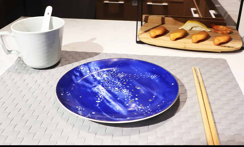Размеры: 20*20*2 см Материал: Керамика Вес: 420 г Цвет: синий Посылка: 1 шт. 1. Украсить вашу жизнь с солнечного дня, украсить вашу еду с звёздное небо. 2. Роскошный золотой вставкой, красивый принт со звездой, это стильно, со вкусом и новизны.