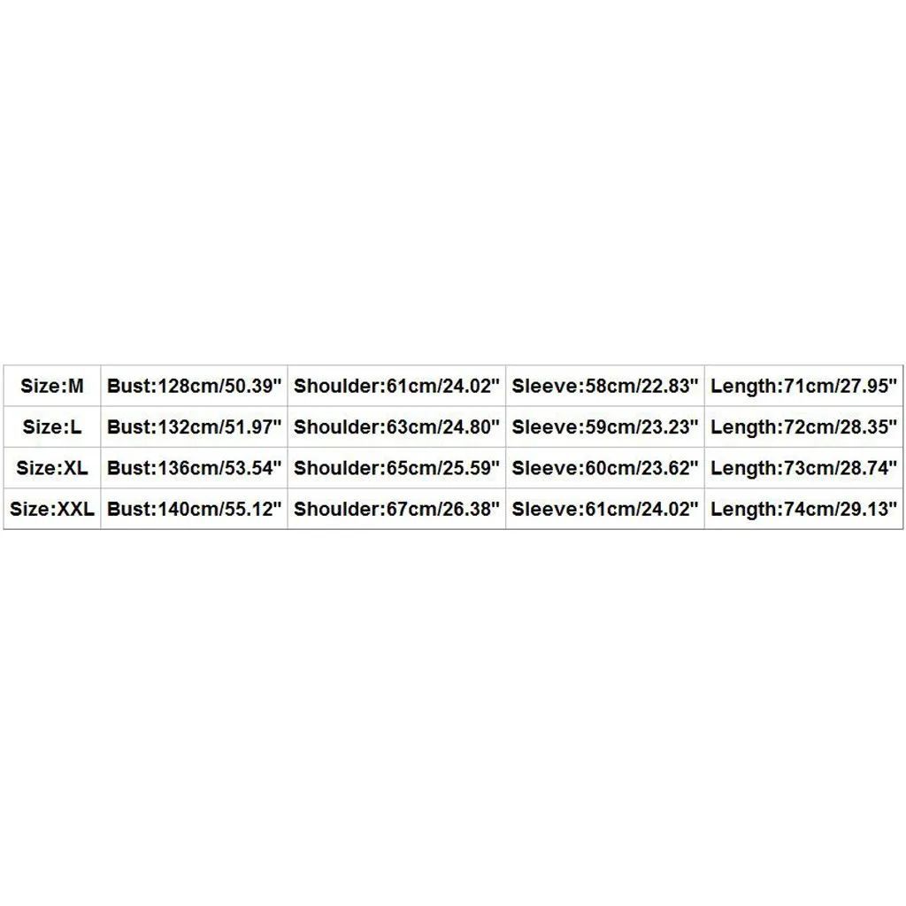 | Size:XXL | Bust:140cm/55.12'' | Shoulder:67cm/26.38'' | Sleeve:61cm/24.02'' | Length:74cm/29.13'' |