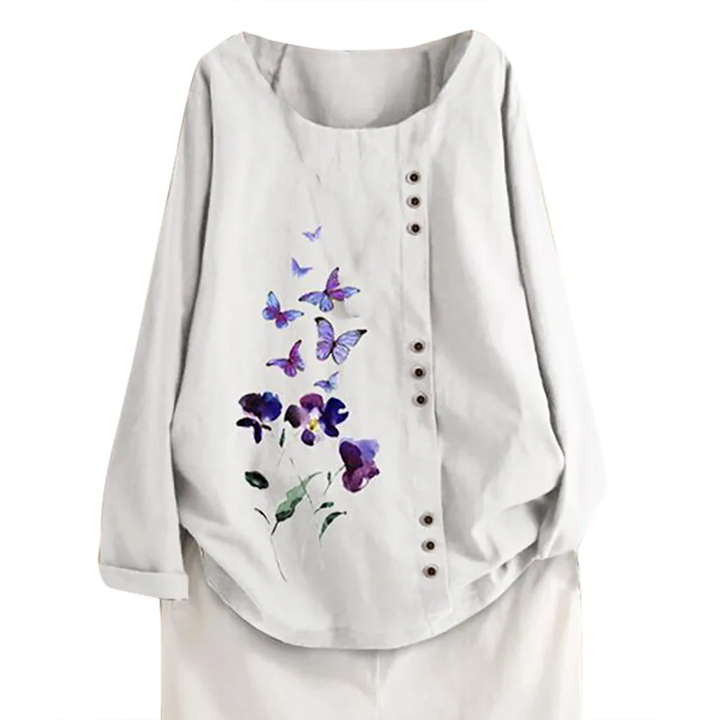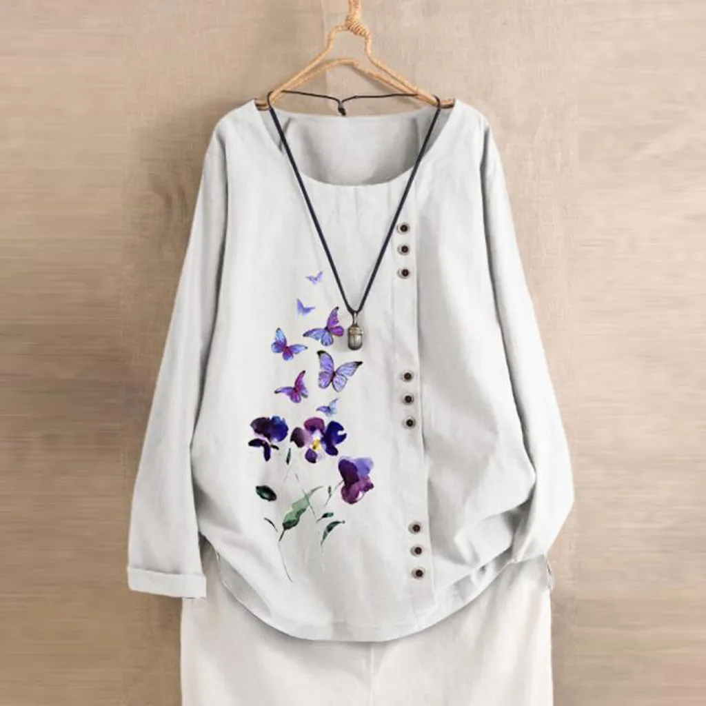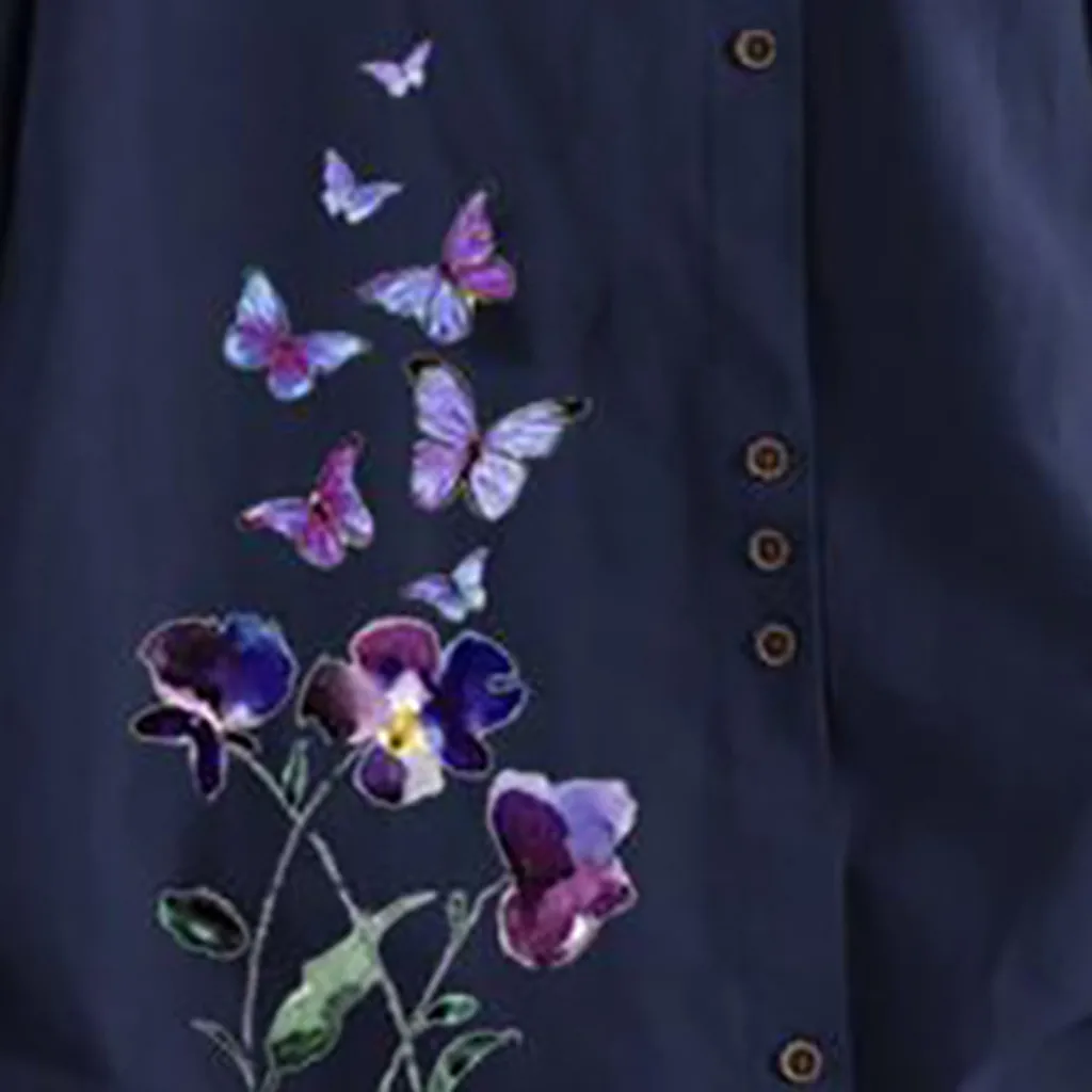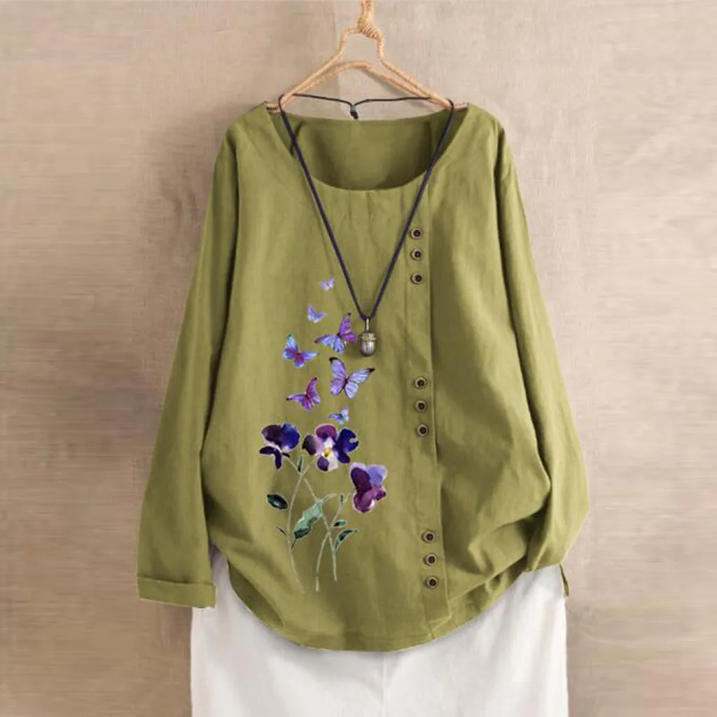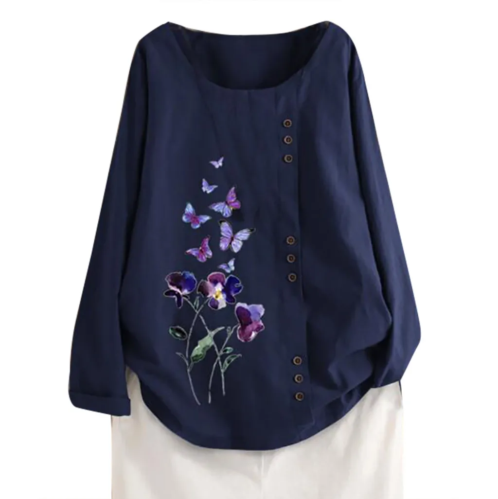 Особенности: хлопок и лен, винтажный стиль размера плюс, v-образный вырез, вышивка, пуговица, Повседневная блуза, длинный рукав,Повседневная одежда; Стильный и модный дизайн; Летние и весенние повседневные топы.