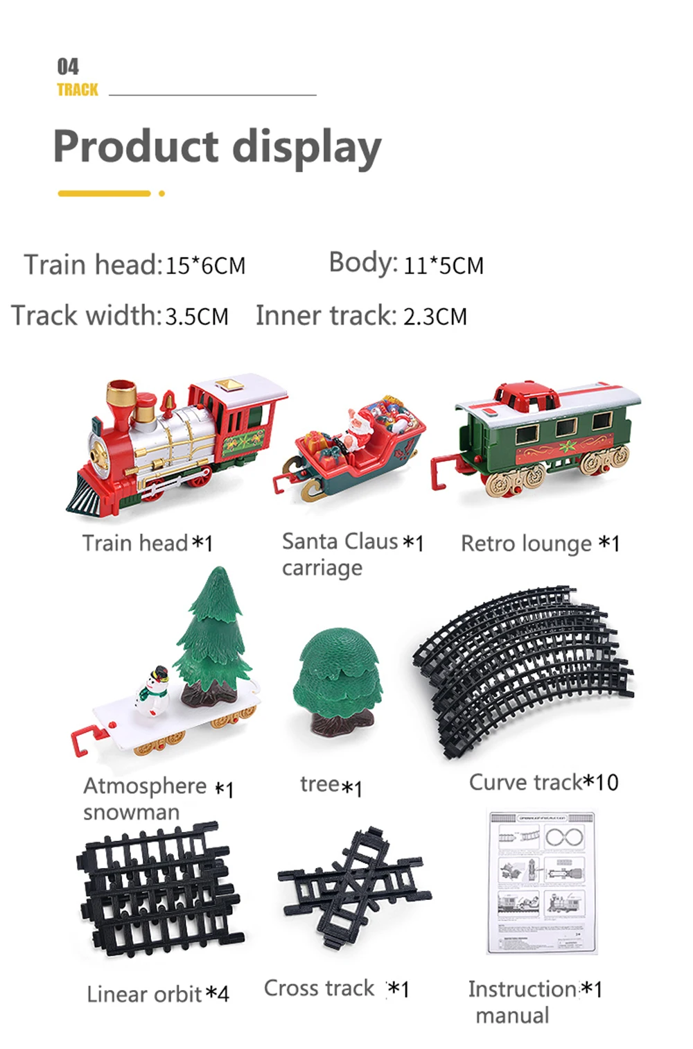 Продукт: 1. Классические рождественские комплекты с поездом. 2. Он оснащен красивыми мелодиями, прохладными огнями, имитацией звуков поезда, фар, реалистичных звуков и т. Д. 3. Материал изготовлен из АБС экологически чистого сырья, которое безопасно и безопасно. 4. Имитационное моделирование; колесо поезда имитирует реальный поезд, и колесо тянутся при ходьбе, чтобы повысить когнитивную способность ребенка. 5. Требуется батарея: две батарейки AA для контроллера (не входят в комплект). Информация о продукте: Название продукта: Рождественский поезд 22 шт. Посылка Размер продукта: около 40*31*5 см/15,75*12,20 * 1.97in. Возраст: 3 года и старше. Материал игрушки: АБС экологические инженерные материалы Упаковка: цветная коробка