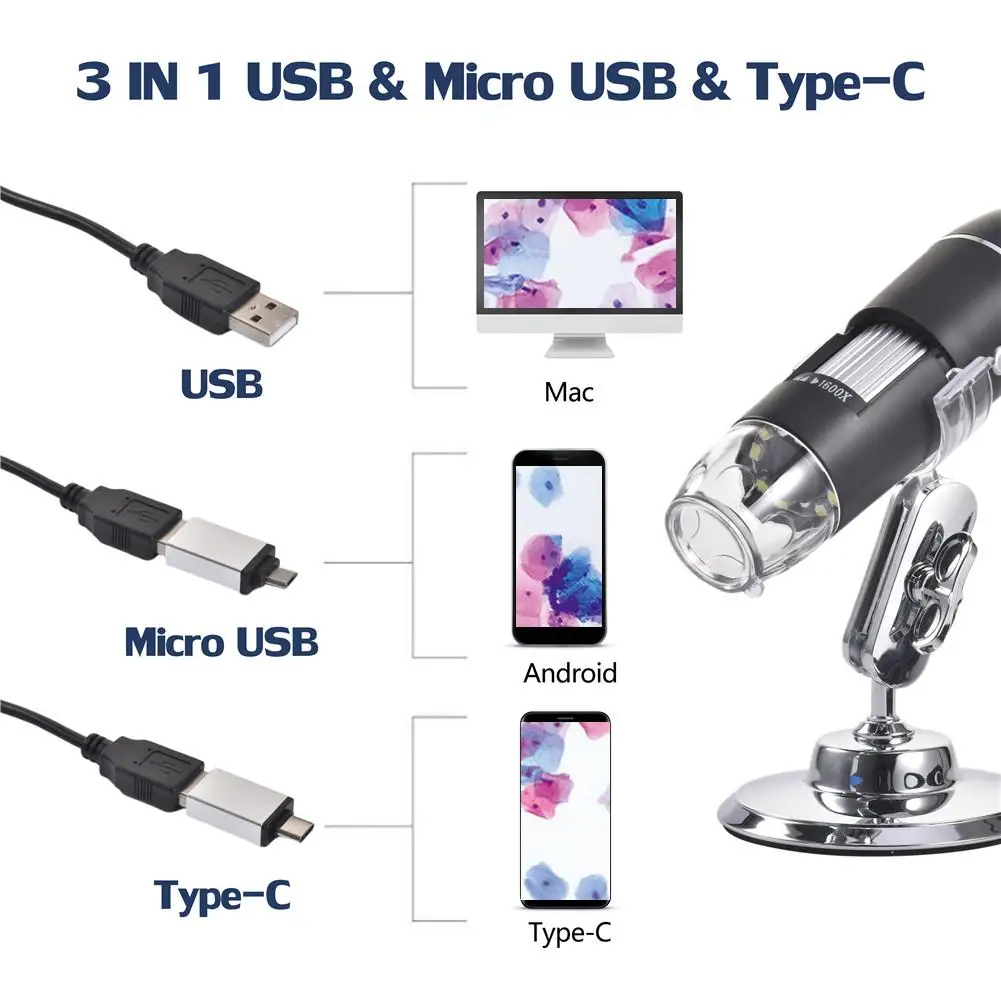 3. Высокое разрешение: продукт имеет кронштейн для легкого наблюдения, обнаружения, фокусировки 1600X, высокого разрешения, поддерживает съемку и запись видео, измерение, маленький и портативный, с источником света.