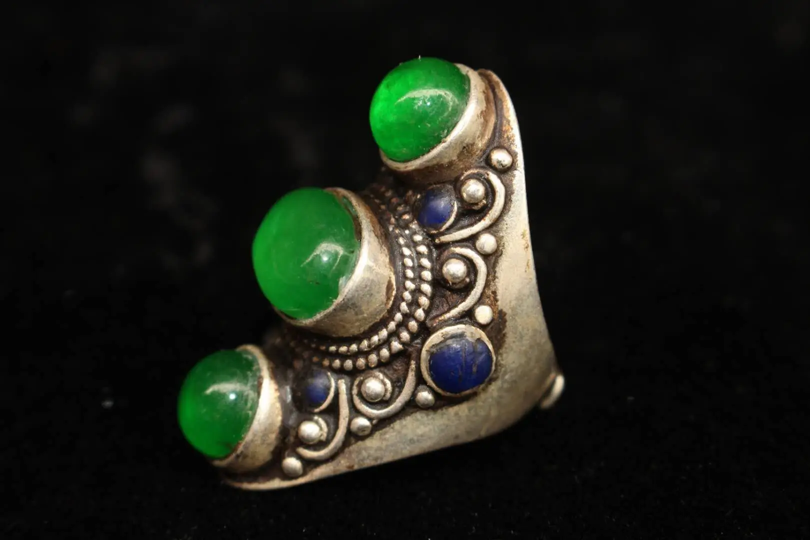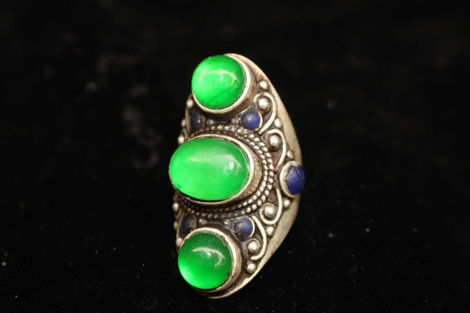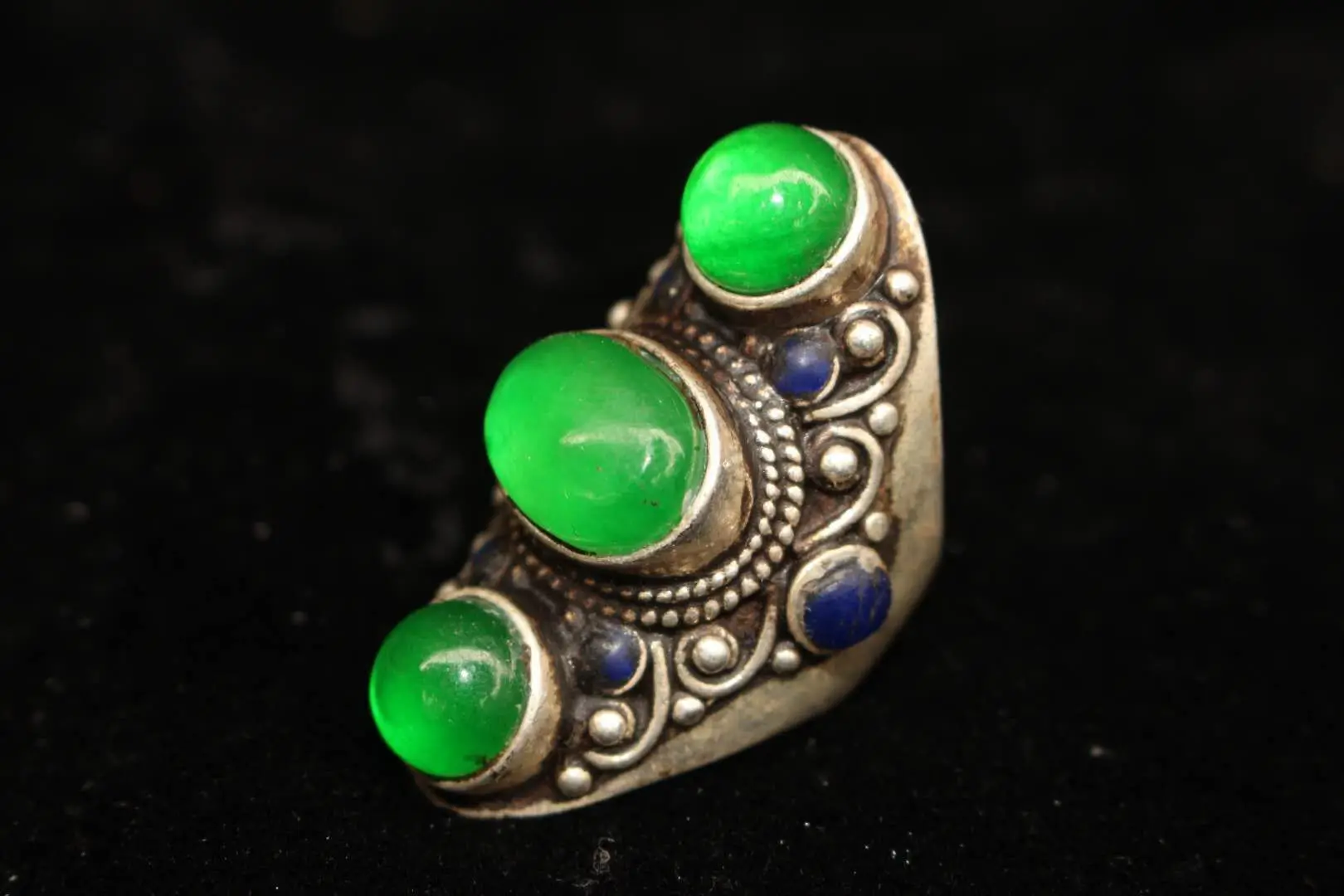 Тибетское и непальское народное старое тибетское серебряное инкрустированное зеленым камнем нефритовое кольцо