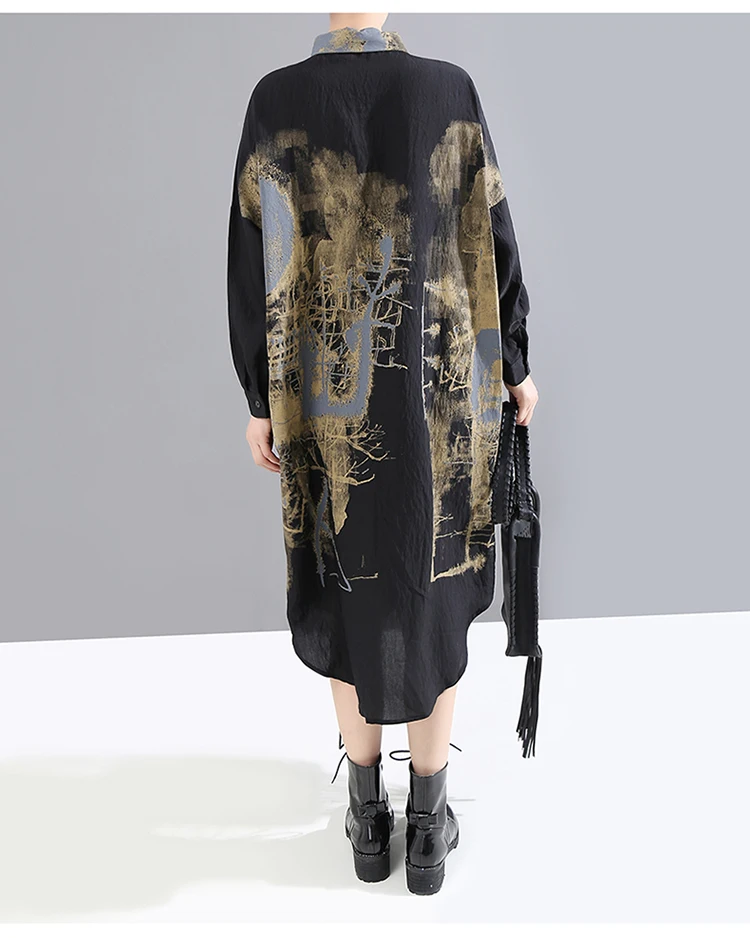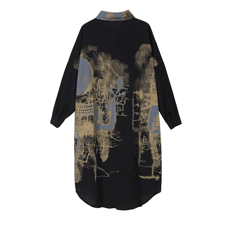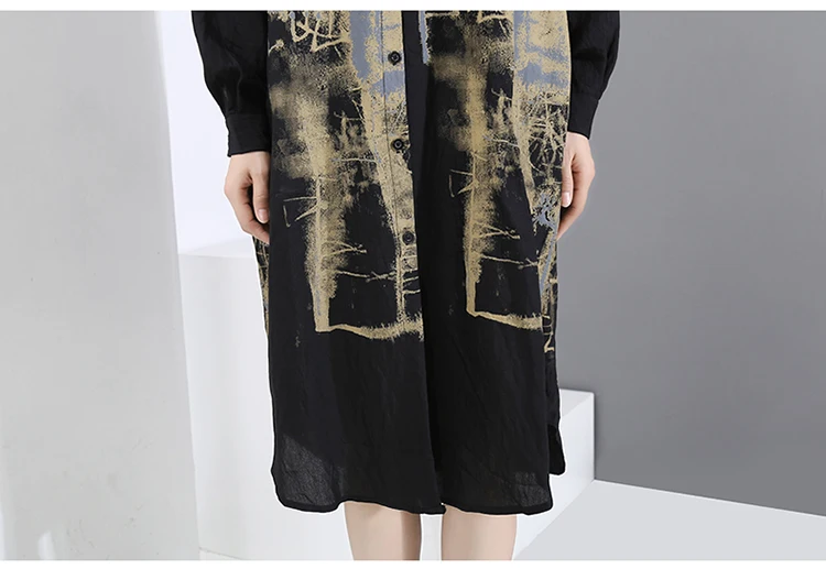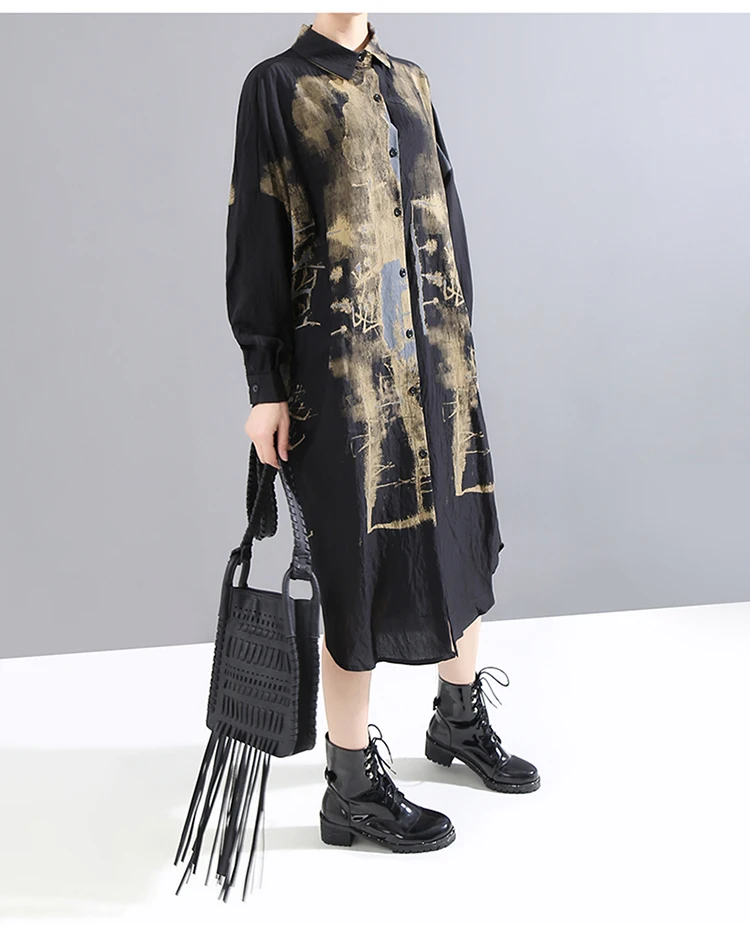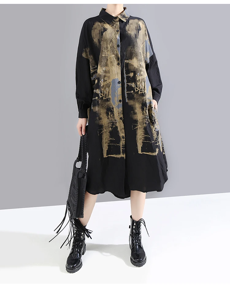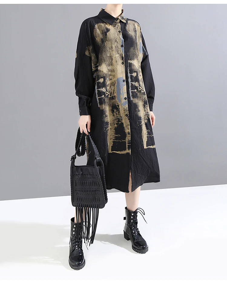 Корейский стиль, женское повседневное винтажное чёрное платье-рубашка с длинным рукавом, с принтом, для девушек, плюс размер, миди прямое платье, Femme 5819