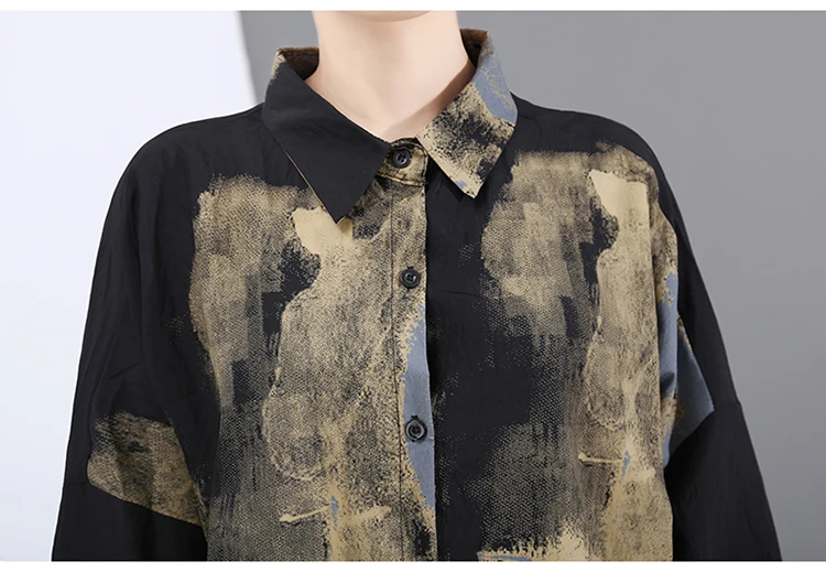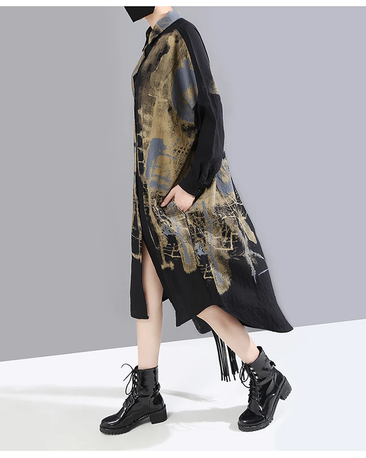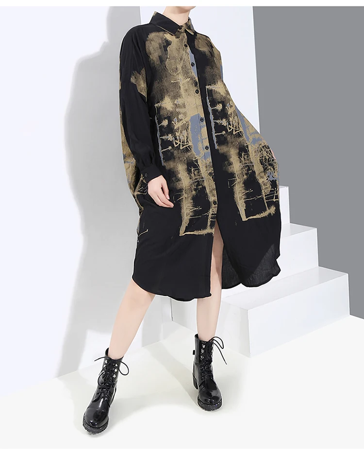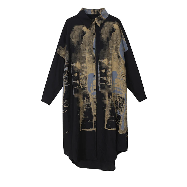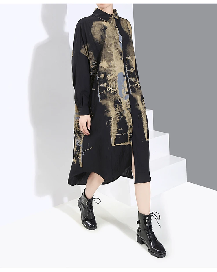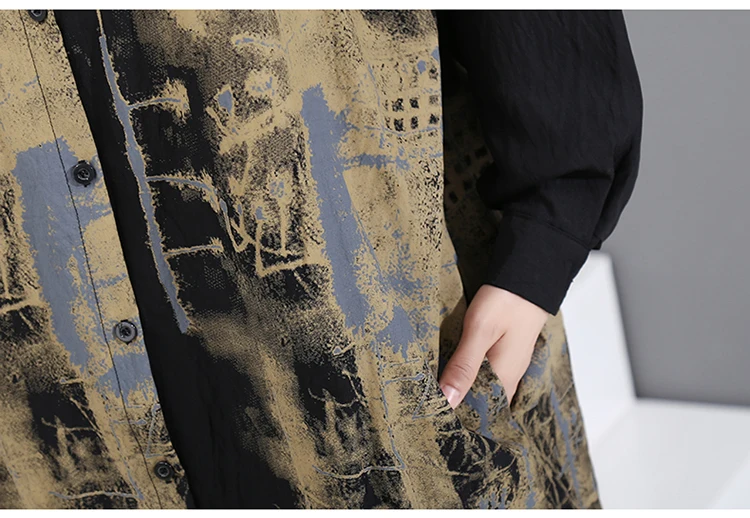 Корейский стиль, женское повседневное винтажное чёрное платье-рубашка с длинным рукавом, с принтом, для девушек, плюс размер, миди прямое платье, Femme 5819