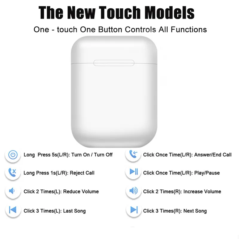Обычно отправляется в течение 1 рабочего дня! 2019 новые i12 Bluetooth беспроводные наушники (Поддержка всплывающих окон для IOS выше 12,1) 1. Версия Bluetooth: Bluetooth V5.0 2. Время работы: 2-3 часа 3. Время зарядки: 1-1,5 часов 4. Емкость аккумулятора: 35 мАч 5. Зарядное устройство: 300 мАч. 6. Расстояние беспроводной связи: 8-12 м 7. Динамик: высококачественный медный кольцевой динамик 8. Вес продукта: 4-5 г (один наушник) 9. Совместимый телефон: совместим с Android, IOS, microsoft и так далее, 100% телефона с bluetooth. Продукт Особенности 1. Короткое воспроизведение (пауза) музыки/ответ на вызов; 2. Двойные (справа) наушники двойное короткое нажатие для уменьшения (увеличения) громкости; 3. Левое (правое) нажатие наушников 3 следующая (последняя) музыка; 4. Siri легко просыпается 5. Отменить открытую ситуацию и закрыть ее до закрытой ситуации; Продукты включают в себя 1 * одна пара bluetooth-гарнитуры 1 * кабель для зарядки 1 * Руководство пользователя
