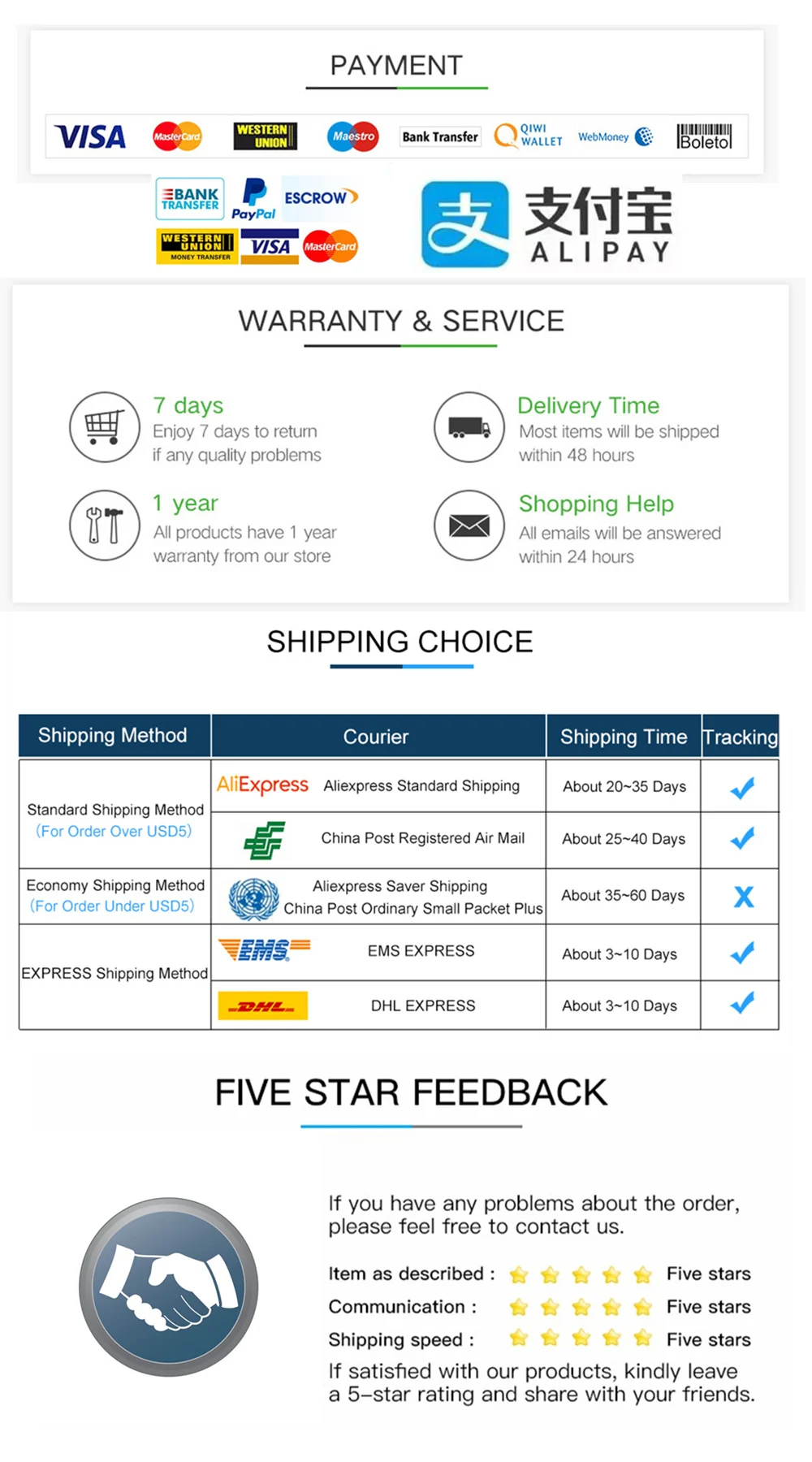 Для оптовых покупателей мы предложим вам оптовую цену и бесплатную Экспресс-доставку (E.g DHL,EMS,Fedex...) срок доставки составляет около 3-7 дней (за исключением отдаленных районов).Для клиентов, осуществляющих прямые поставки, мы отправляем товары непосредственно вашим клиентам и не размещаем в посылка какую-либо нашу информацию.Как я могу отследить свою посылку?Вы можете отследить свою посылку на этом веб-сайте по вашему номеру отслеживания: www.17track.net/en (скопируйте в браузер, чтобы открыть)Что я могу сделать, когда время защиты покупки истекает?Если время защиты вашей покупки истекает, пожалуйста, свяжитесь с нами, мы можем помочь вам продлить его. Так что ваши деньги не будут на наш счет. И мы постараемся сделать все возможное, чтобы следить за вашей посылкой, пока вы не получите ее.Смотрите так же другие товары: