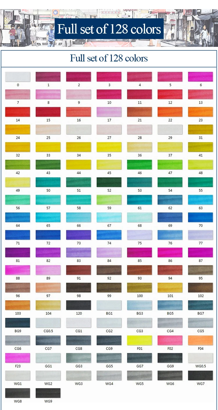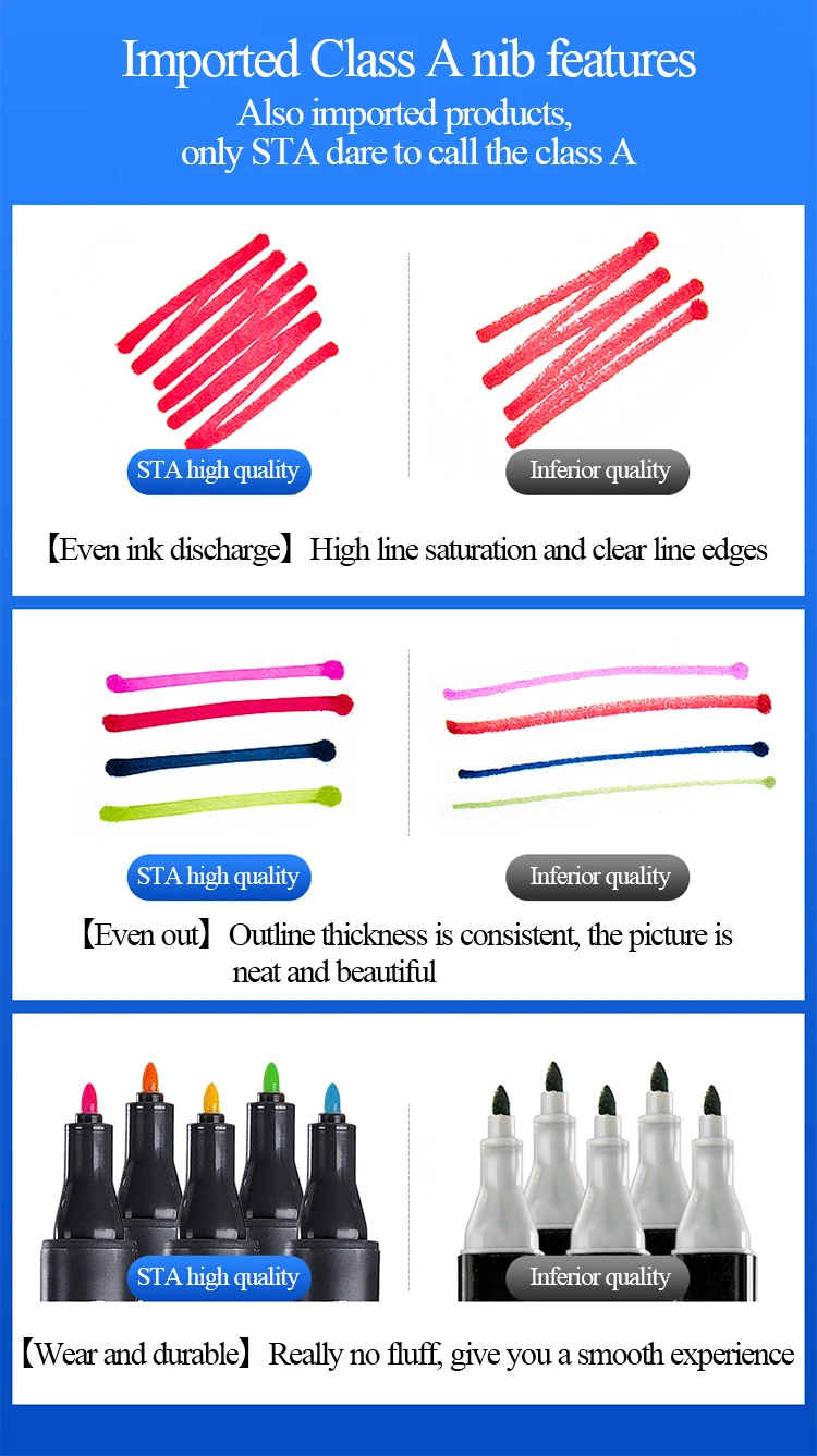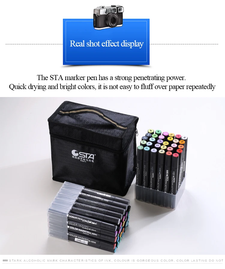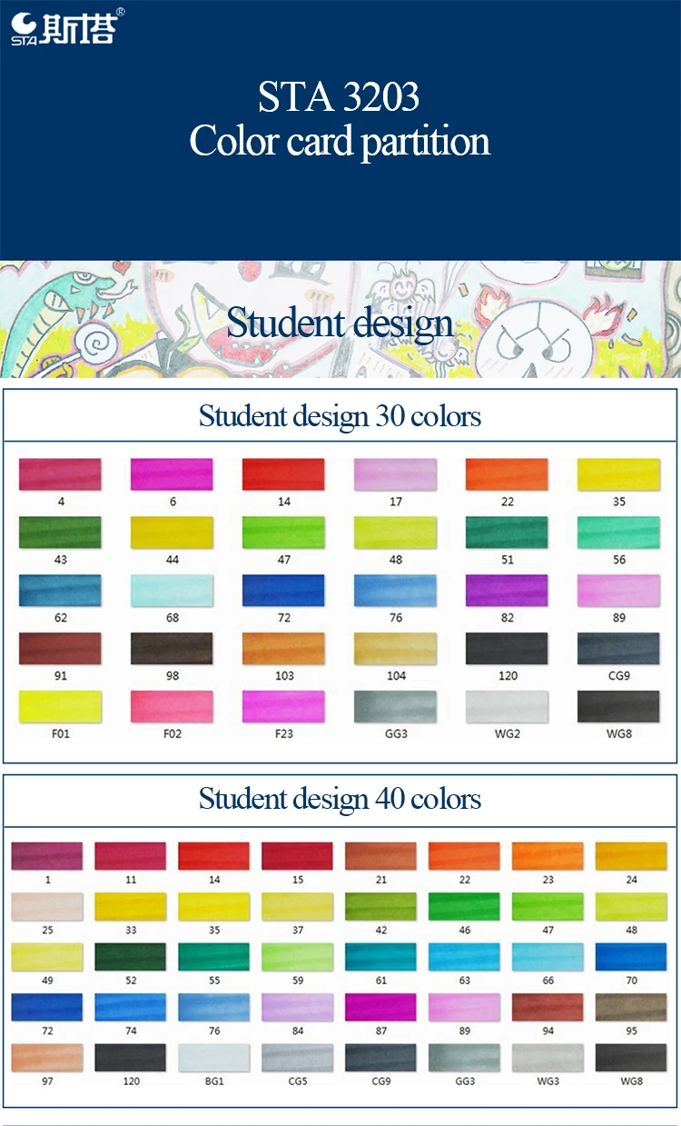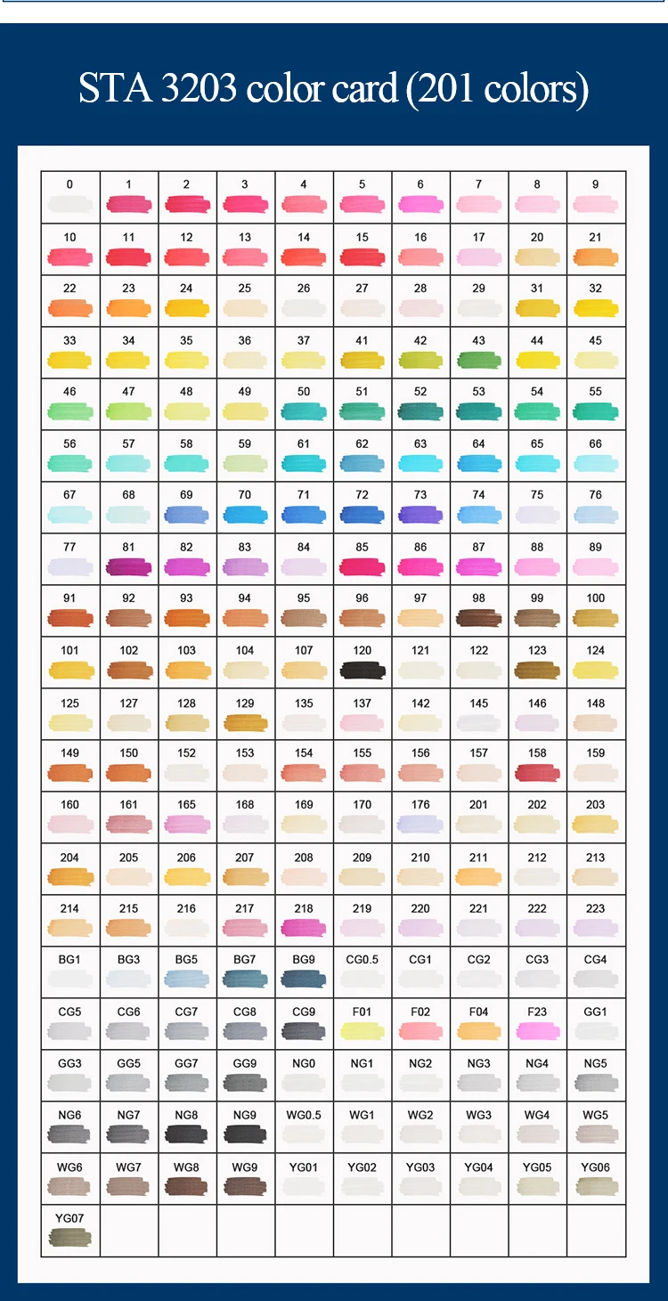 Произведено из немецкого мастерства, импортное перо класса А Профессиональный маркер с ручной росписью Красочные | Потрясающие | Импортные Ночные сорочки класса А | Не пушистые Косой/круглый дизайн с двойными головками Профессиональная цветная система Треугольная ручка-держатель | Удобная ручка | Профессиональный набор | STA master color matching Не нужно беспокоиться о том, насколько сложно выбрать цвет. Выберите различные профессиональные цвета. Удовлетворить профессиональные потребности художников Аниме | Пейзаж | Одежда | Здание | Студентка | В помещении Общее назначение | Укажите хорошее качество Информация о продукте Наименование: алкогольный маркер STA Модель: NO.3203 Двойная головка: Да Форма головки ручки: наклонная головка/круглая головка Толщина письма: круглая головка 1 мм/косая головка 6 мм На пути искусства, STA с вами, как и жизнь, выберите STA. Во время обучения и творения позвольте STA быть с вами. Дизайн с двойными головками для удовлетворения различных потребностей в живописи