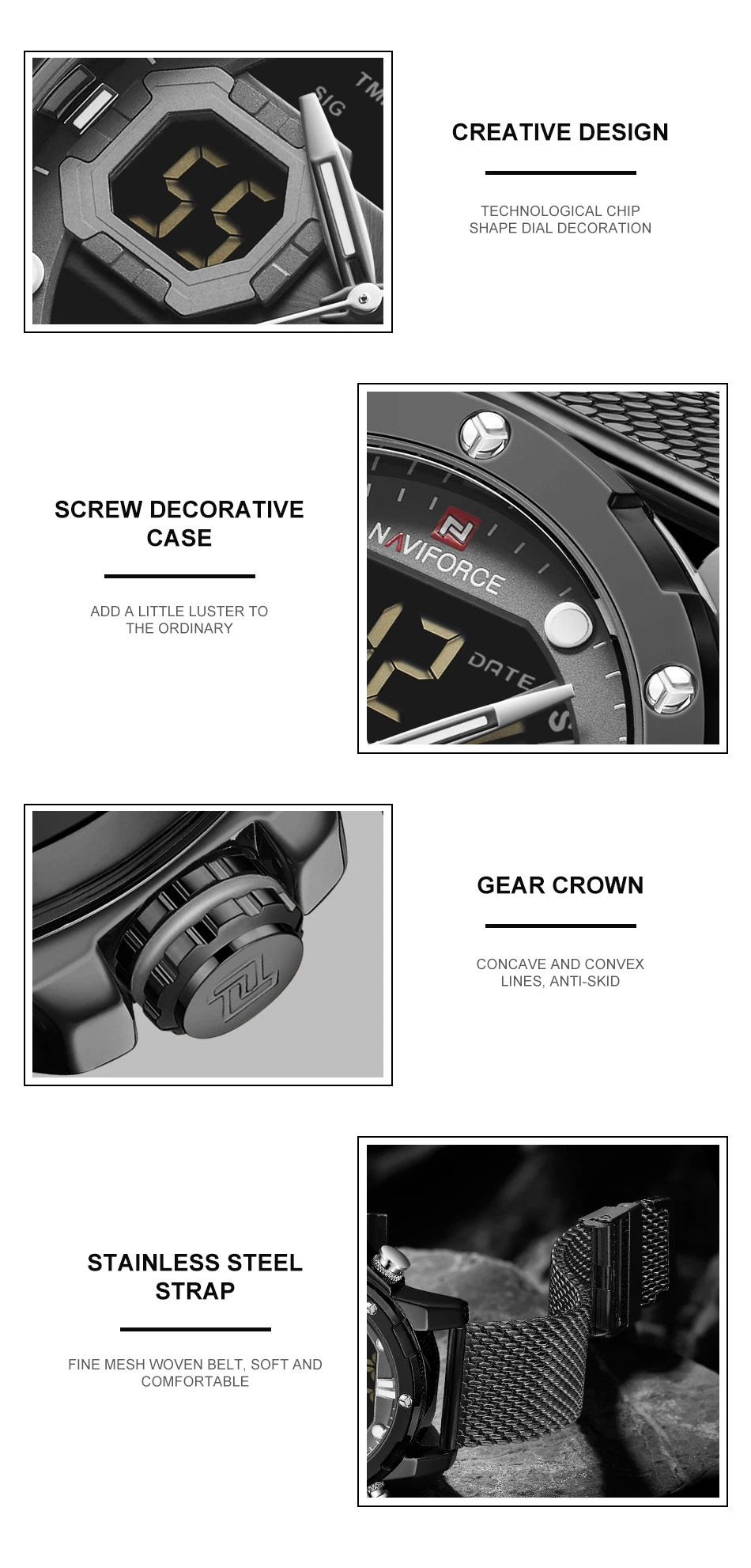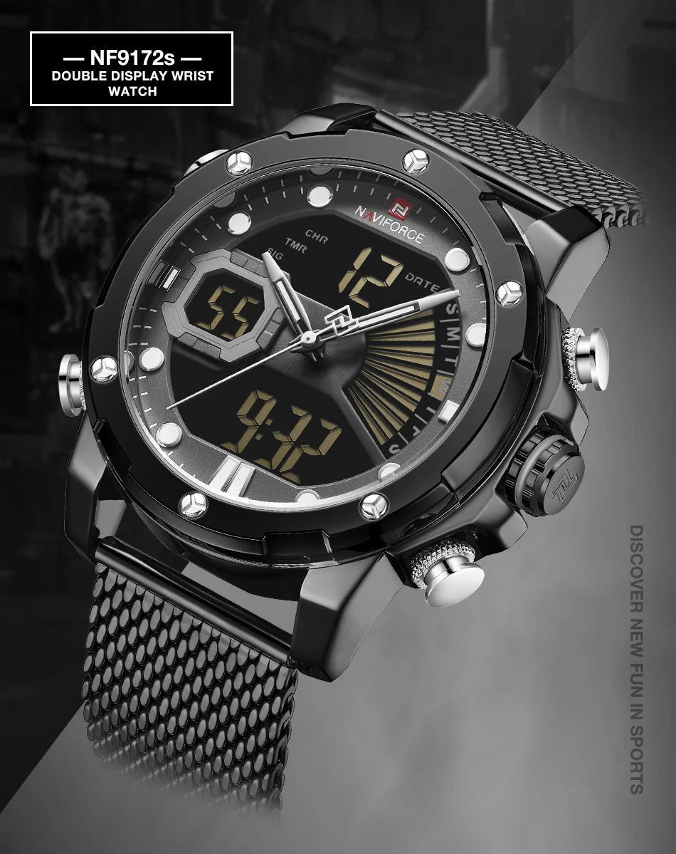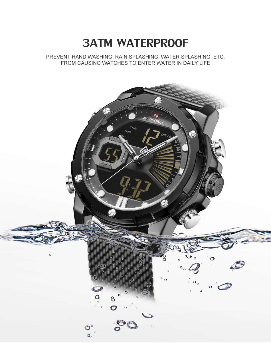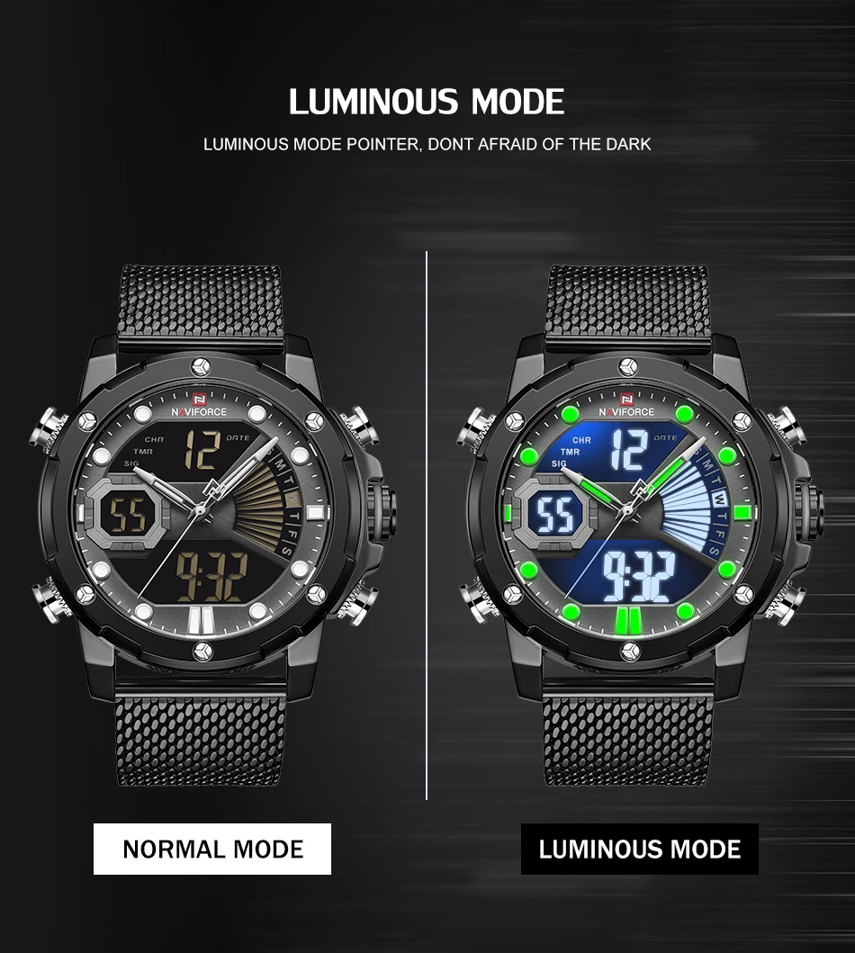 Модель: NAVIFORCE NF9172S Часовой механизм: кварцевый механизм Пол: Для мужчин и мужской Стиль: Модный, повседневный и спортивный Тип стекла циферблата: закаленное минеральное стекло Материал ремешка: ремешок из нержавеющей стали Тип застежки: складная застежка Диаметр циферблата: 45 мм Чехол Толщина: 16mm Длина ремешка: 250 мм Ширина ремешка: 23 мм Вес изделия: 156 г Особенности: 30 м Водонепроницаемость, Дата Неделя год, двойной дисплей времени будильник, светящийся, хронограф