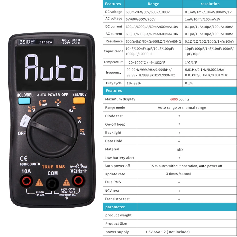 Многофункциональный инструмент: используется для тестирования напряжения переменного/постоянного тока, переменного/постоянного тока, сопротивления, емкости, частоты, рабочего цикла, температуры, NCV, диода и непрерывности.