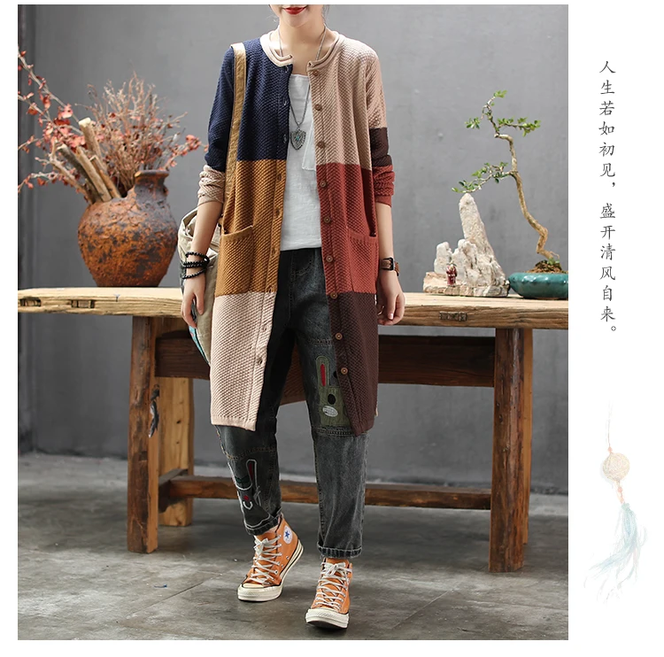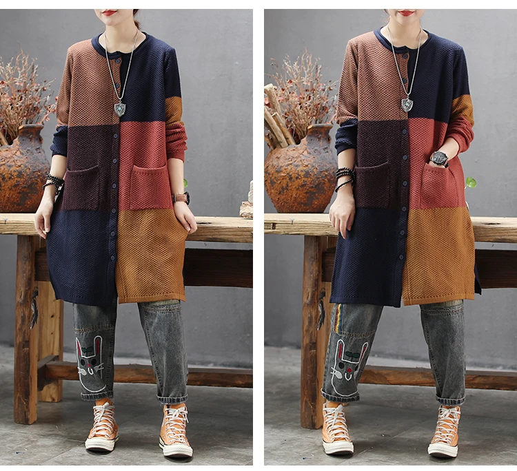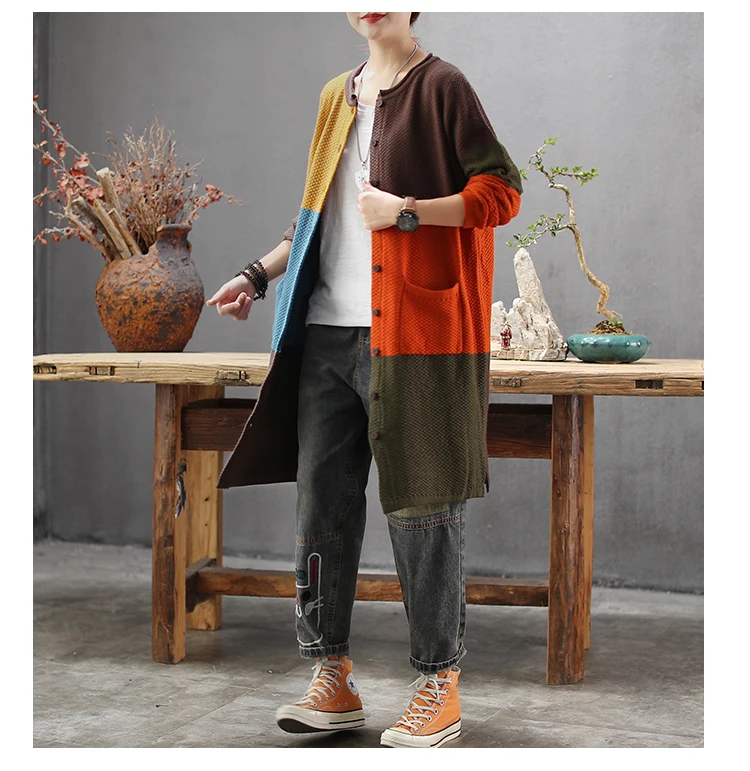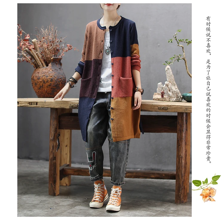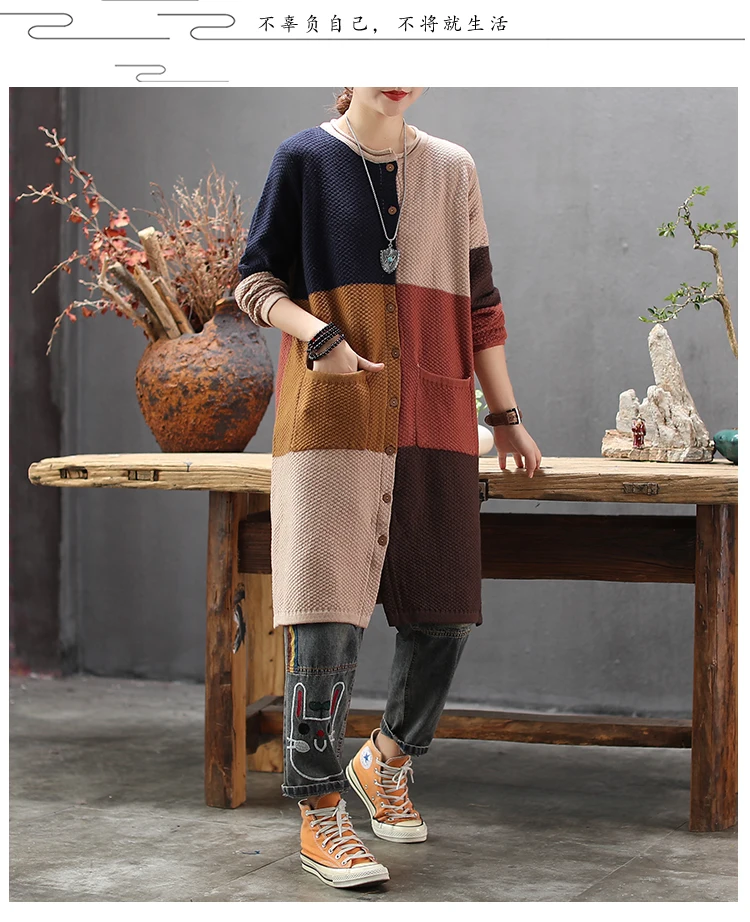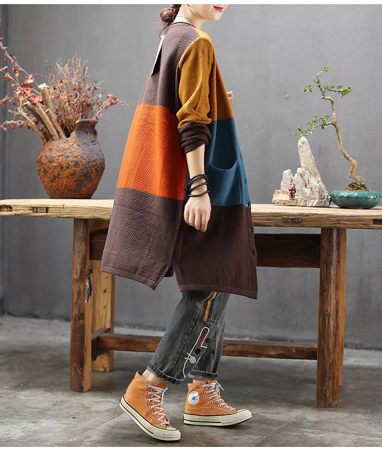Женский свитер, вязаный кардиган, осень весна 2020, тонкое однобортное свободное винтажное женское длинное пальто с длинным рукавом контрастного цвета