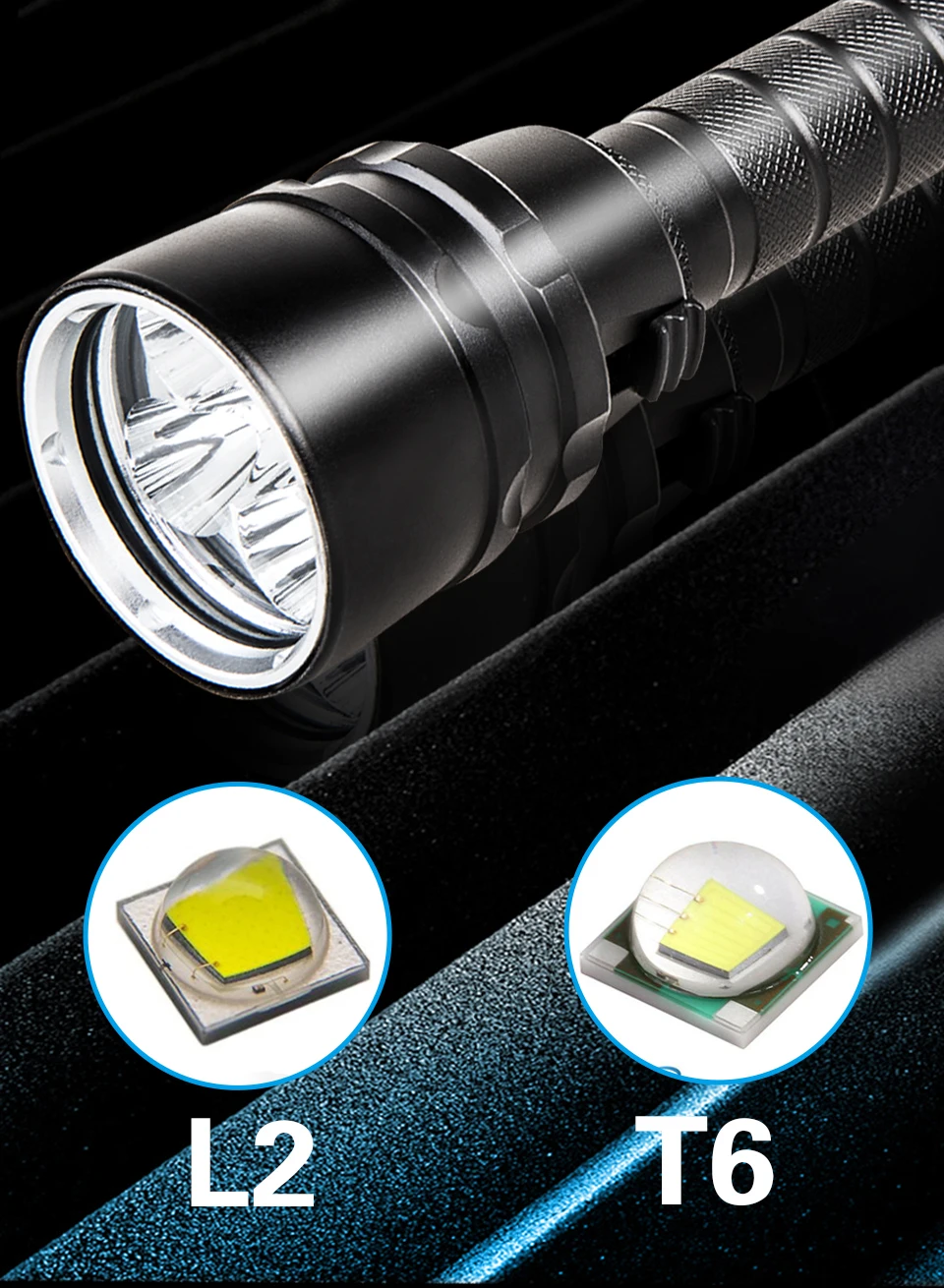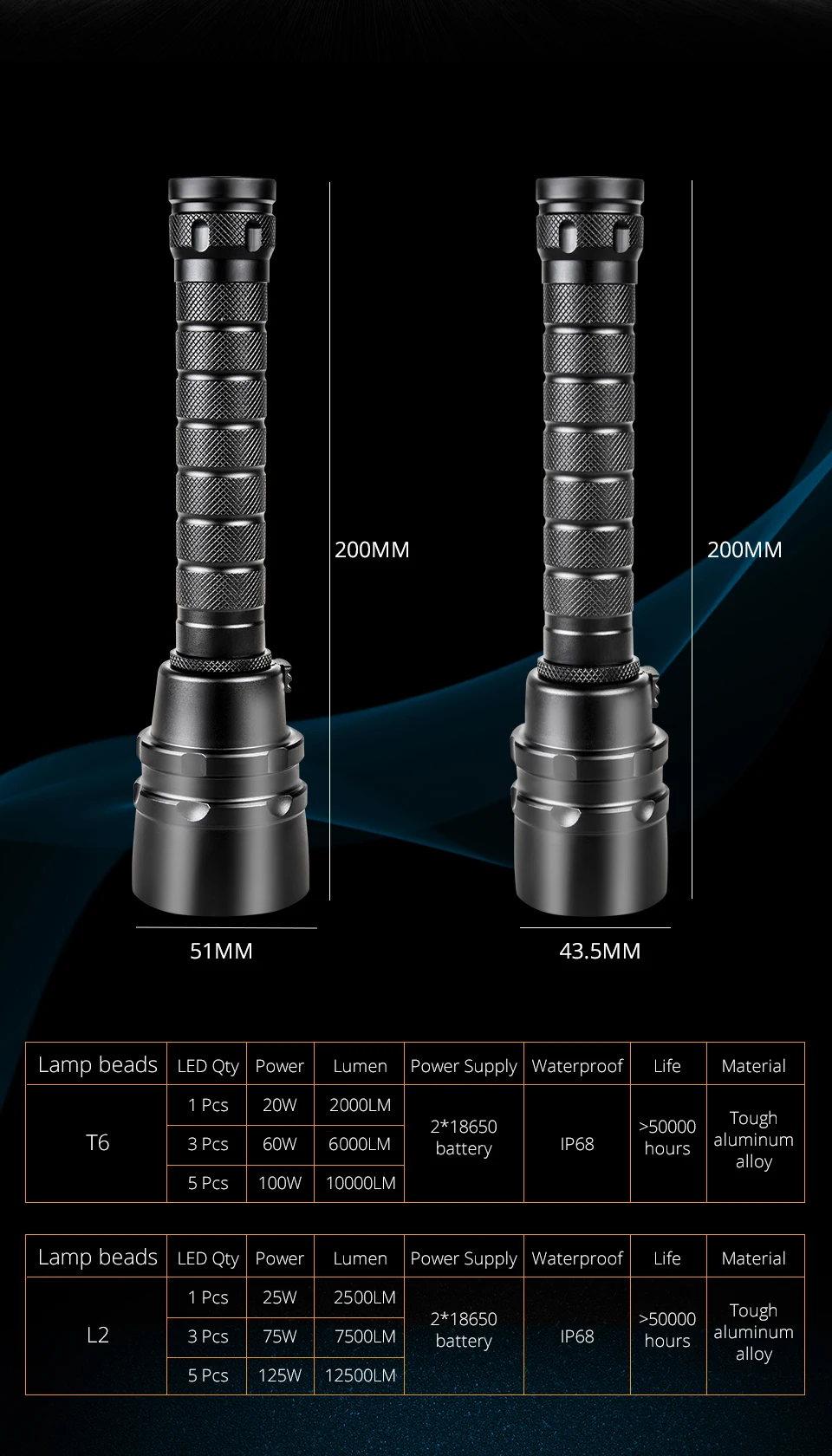 Особенности: Этот фонарь использует светодиодный T6/ L2, производя очень яркий светильник. Внутренняя проводка применяет высокоэффективный усилитель цепи, и может использовать батареи в большой степени Корпус этого фонарика изготовлен из авиационного алюминиевого сплава и имеет очень прочную конструкцию. Жесткая анодированная отделка; Анти-абразивный, не царапается, ударопрочный. Ультраглубокий Противоскользящий эффект trench structuresi отлично подходит для дайвинга В этом фонарике используется текстурированный отражатель (а не гладкий отражатель). Луч из текстурированного отражателя более ровный, с более постепенным переходом между горячим пятном (центром пучка) и разливом (периферией пучка). Технические характеристики: Тип эмиттера: T6/L2 (блестящий белый цвет) Светильник Цвет: белый Количество СВЕТОДИОДНЫЙ: 1 шт./3 шт./5 шт. Батарея конфигурации: 2 х 18650 3,7 v Напряжение Вход: 8,4 v Переключатель Тип: пуш-ап Светодиодный чип на плате) Срок службы: 50000 часов Материал: Алюминий