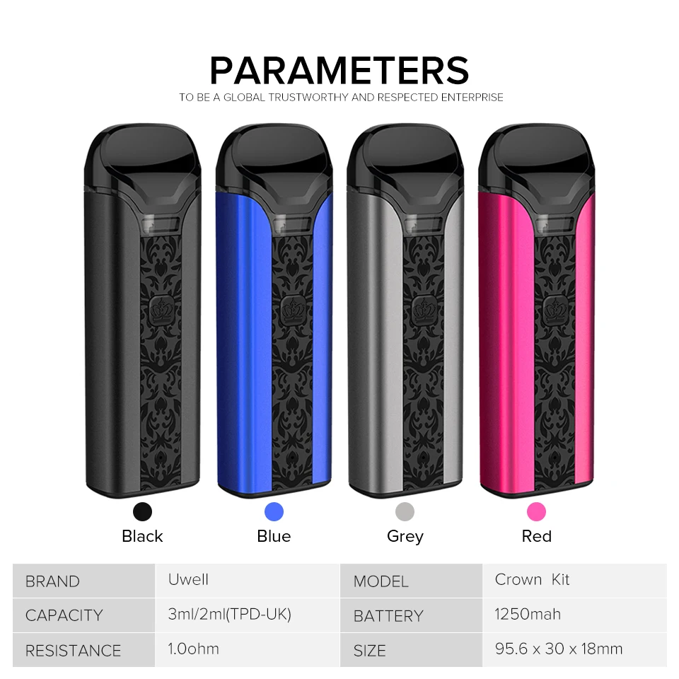 Size: 95.6 x 30 x 18mm Capacity: 3ml/2ml(TPD-UK) Battery: 1250mah Maximum Wattage: 25W Resistance: 1.0ohm Color: Black, Grey, Blue, Red