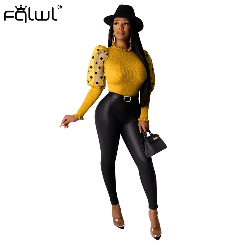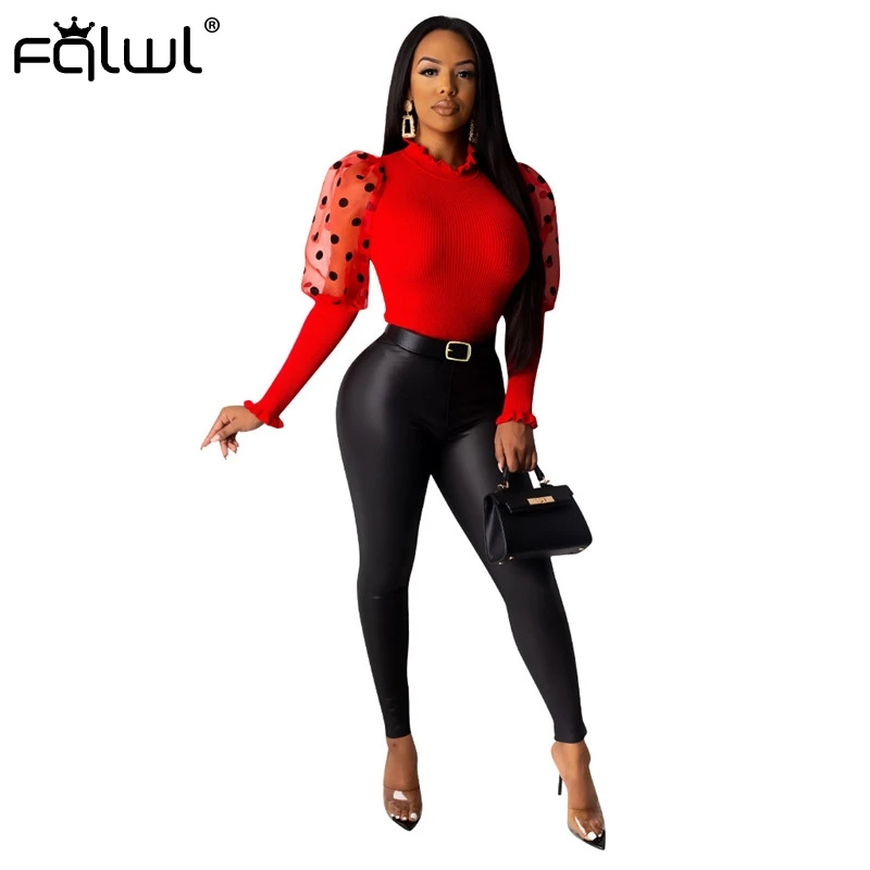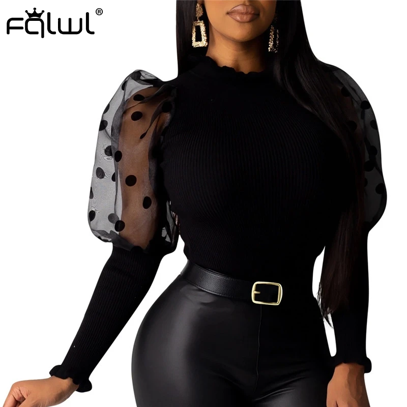 FQLWL, сетчатая трикотажная Сексуальная Блузка в горошек с оборками, женская рубашка, топы, пэчворк, с пышными рукавами, белая, черная, облегающая, женская блузка