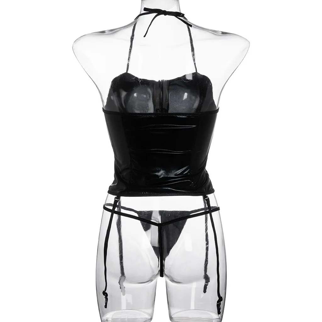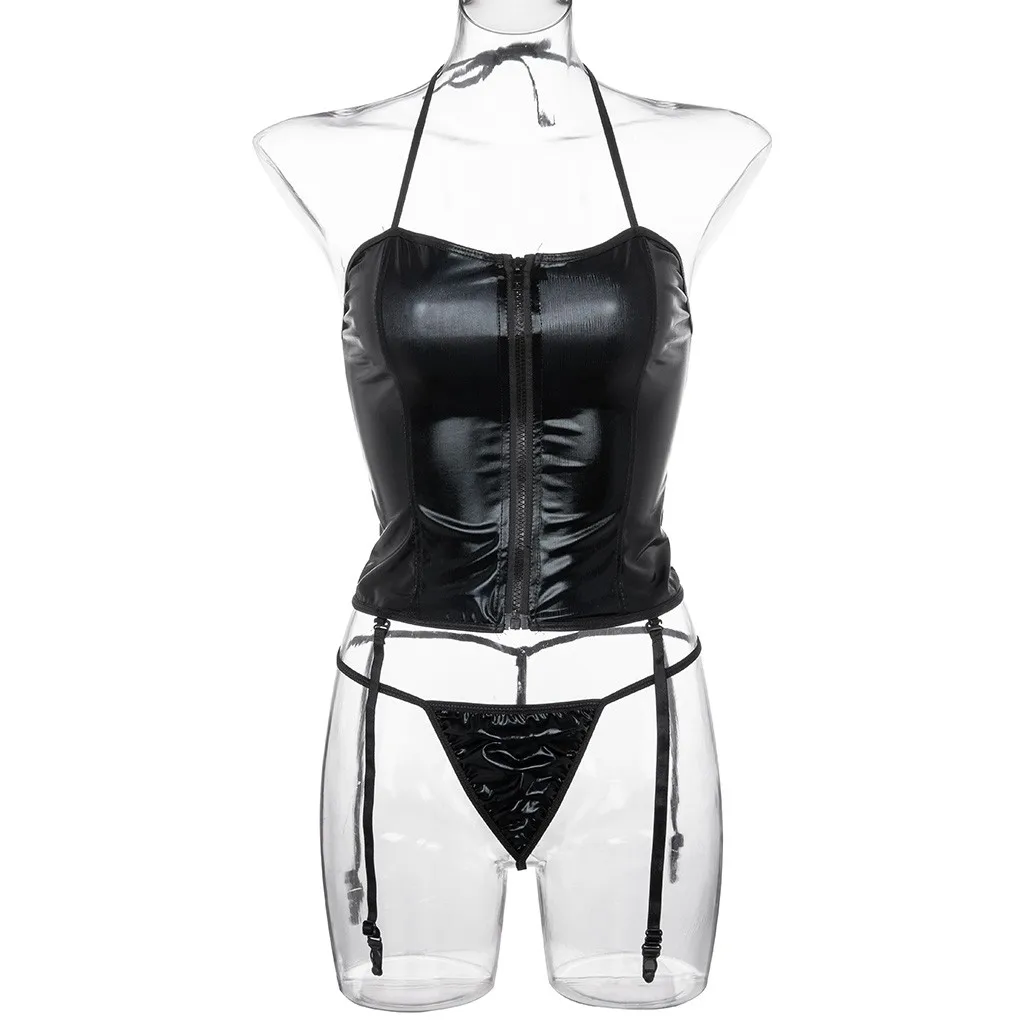 Сексуальное кожаное женское нижнее белье, на молнии, эротическое сексуальное нижнее белье, Тедди, сексуальные костюмы, порно, Babydoll, корсет, подвязки, стринги, набор