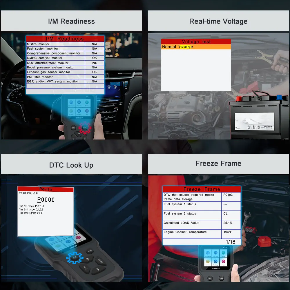 Считывание диагностического кода ошибки очистить код ошибки (очистить код ошибки и выключить MIL) двигатель оборотов в минуту (об/мин) Рассчитанное значение нагрузки температура охлаждающей жидкости состояние топливной системы скорость кратковременная топливная ситуация долгосрочная топливная ситуация впускной коллектор давление впрыск топлива предоплата время впуска воздуха Температура потока воздуха дроссельная заслонка Абсолютное Положение Обнаружение кислорода напряжение, связанное с состояние топливной системы, мониторинг расхода топлива, И т. д.