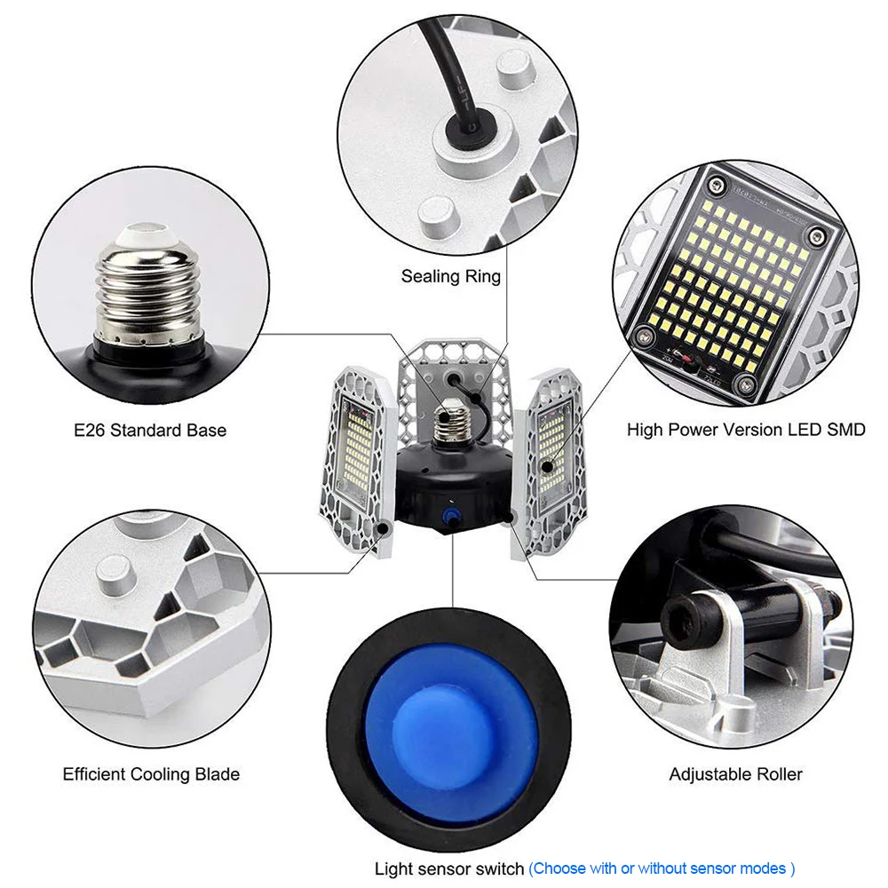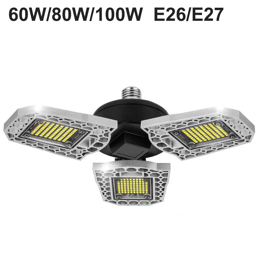 【Супер яркий 】60 Вт 7200 лм, 80 Вт 9600 лм, 100 Вт 12000 лм, теплый белый 2700-3500 К и холодный белый 5500-6000 К, без темных зон, ореолов или бликов. Гаражный светодиодный потолочный светильник выбрасывает потрясающий светильник, уникальный широкоугольный дизайн, обеспечивает лучший светильник ed. Высокая Мощность люменов делает этот светодиодный светильник для гаража идеально подходит для гаража, склада, подвала, сарая, офиса, станции, чердака, мастерской, выставочной зоны и т. Д.