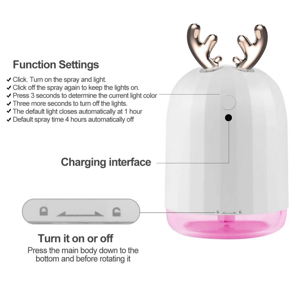 1. Откройте верхнюю крышку против часовой стрелки. Добавьте воду в прозрачный резервуар. Затяните верхнюю крышку. Когда серебро полностью поглощает воду, включается источник питания. 2. (1) Нажмите на машину, чтобы распылить и светильник дыхательный светильник s. (2) Нажмите кнопку выключить распылитель еще раз и удерживайте лампу дыхания. (3) Нажмите 3 секунды в длину, чтобы зафиксировать Эффект Цветной дыхательной лампы. (4) нажмите на три секунды дольше, чтобы выключить дыхательную лампу. 3. Дыхательная лампа увлажнителя автоматически отключается в течение 1 часа. Могут быть открыты снова 4. Время распыления увлажнителя автоматически закрывается в течение 4 часов. Могут быть открыты снова