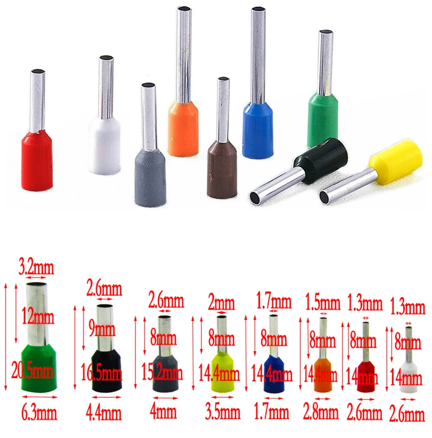 Название продукта: изолированная концевая клемма шнура Номер изделия: E0508/E7508/E1008/E1508/E2508/E4009/E6012 Максимальное напряжение: 150 °C UI = 300 в Материал: медь Изоляционный материал: ПВХ, нейлон Длина чистой меди: 8 мм A.W.G: 22-10 Размер кабеля: 0,5 мм ~ 6,0 мм Покрытие: Гальваническое Олово Цвет: красный/желтый/синий/черный/зеленый/белый/серый/коричневый/оранжевый