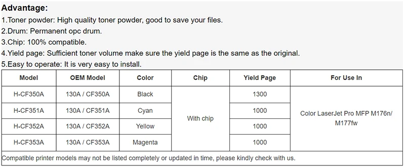 Татрикс Премиум Совместимый лазерный цветной тонер-картридж CF350A CF351A CF352A CF353A 130A для принтера hp MFP M176n M177fw