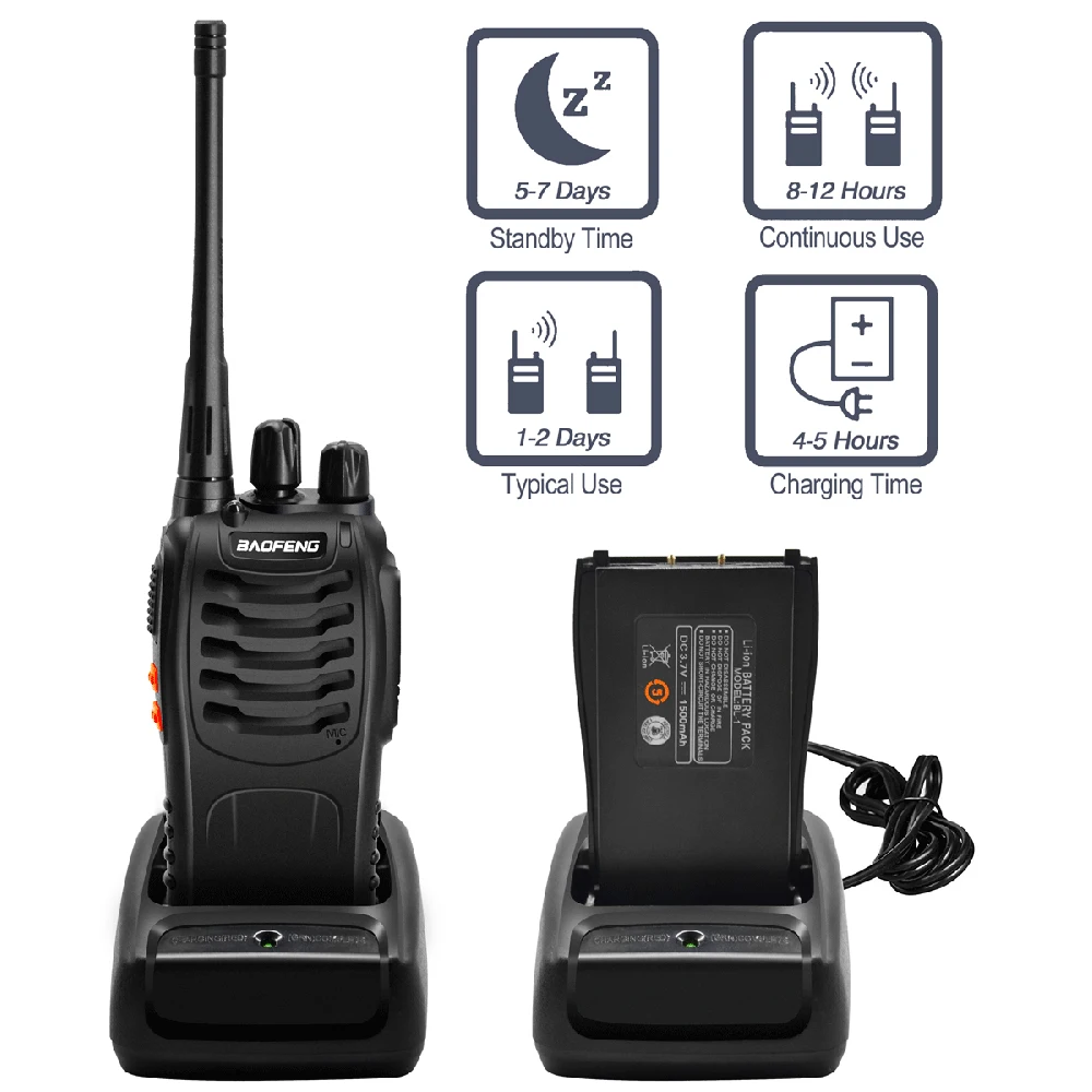 Комплект поставки: 2 * BAOFENG Радио BF-888s 2 * Литий-ионный аккумулятор 2 * антенна 2 * Зажим для ремня 2 * зарядное устройство (Евро вилка) 1*Руководство пользователя Примечание: выберите подходящую посылка в соответствии с вашим запросом Функции: 50 CTCSS/105 CDCSS Функция VOX Голосовая подсказка Программирование ПК Аварийная сигнализация Интеллектуальная Зарядка Экономия батареи Оповещение о низком напряжении Таймер отключения времени Фонарь светильник Характеристики: Модель: Baofeg BF-888S Частотный диапазон UHF 400-470 МГц Мощность канала: 16 Расстояние между каналами: 25 кГц Рабочее напряжение: 3,7 В Аккумулятор: литий-ионный аккумулятор 1500 мАч Срок службы батареи (5-5-90 рабочий цикл) около 8 часов Стабильность частоты: plusmn2.5ppm Рабочая температура: -30 дегк-+ 60 дегк Сопротивление антенны: 50 Омега Дальность связи около 6 км Размеры: 120*58*33 мм Вес (с батареей/антенной) 340 г Функция FM: нет Скремблер: нет