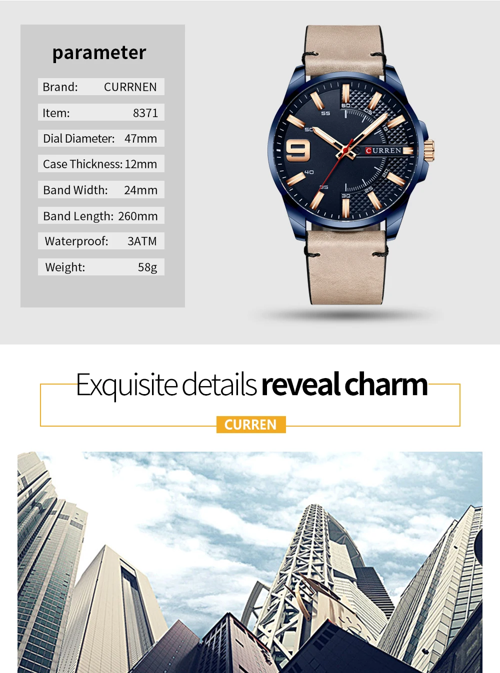 Циферблат Диаметр: 47 мм чехол Толщина: 12 мм часы Длина: 260 мм длина браслета Ширина: 24 мм часы Вес: 58 г