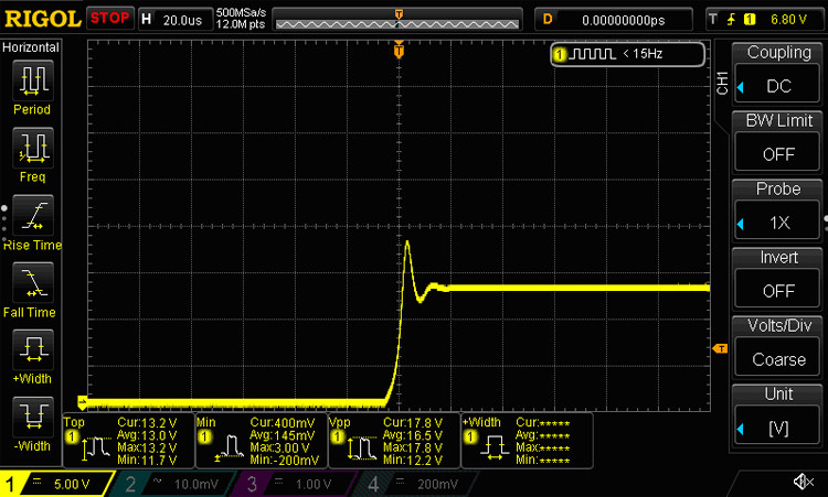 Максимальное напряжение составляет 19 в, а шип напряжения длился около 5 США. После добавления 100 мкФ/16 в (NXB16VB100M5 * 11_LO) конденсатор, мы получили гораздо более медленный и меньший шип: