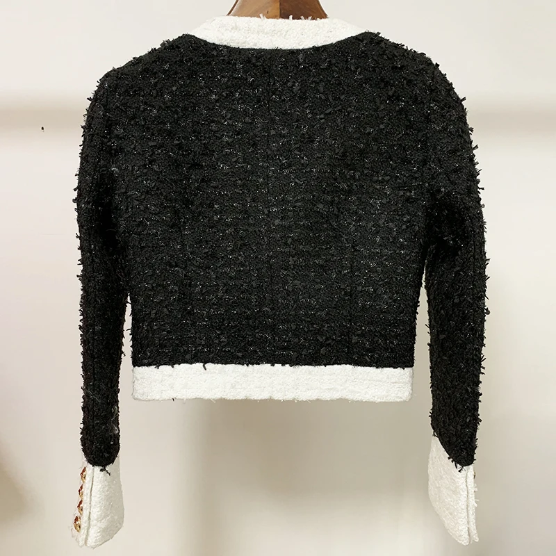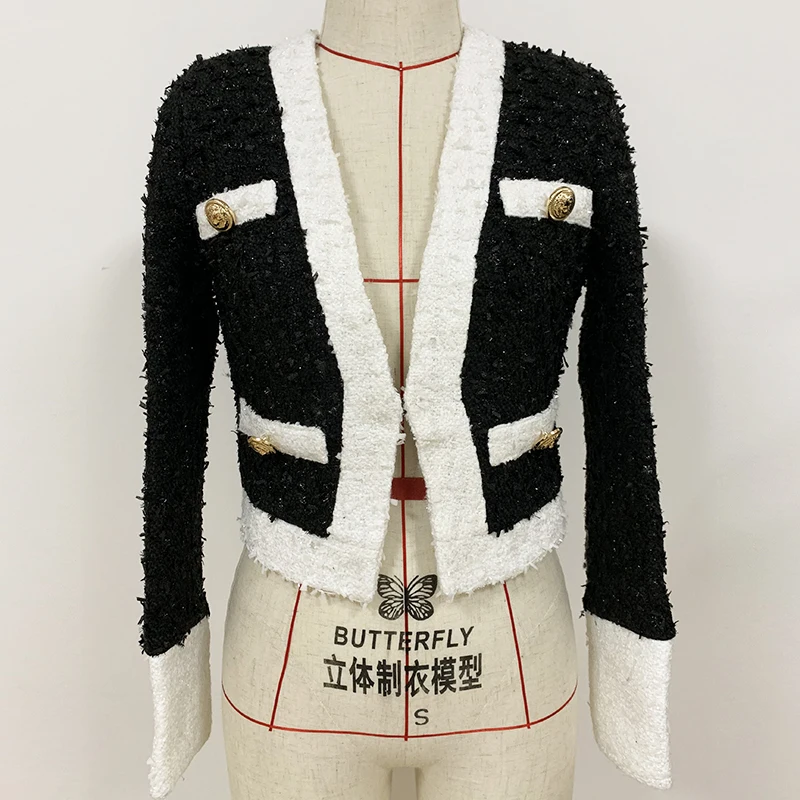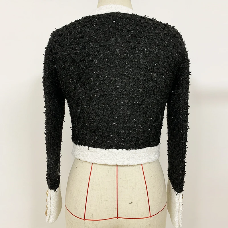 Женское твидовое пальто с бахромой элегантное черное приталенное короткое v