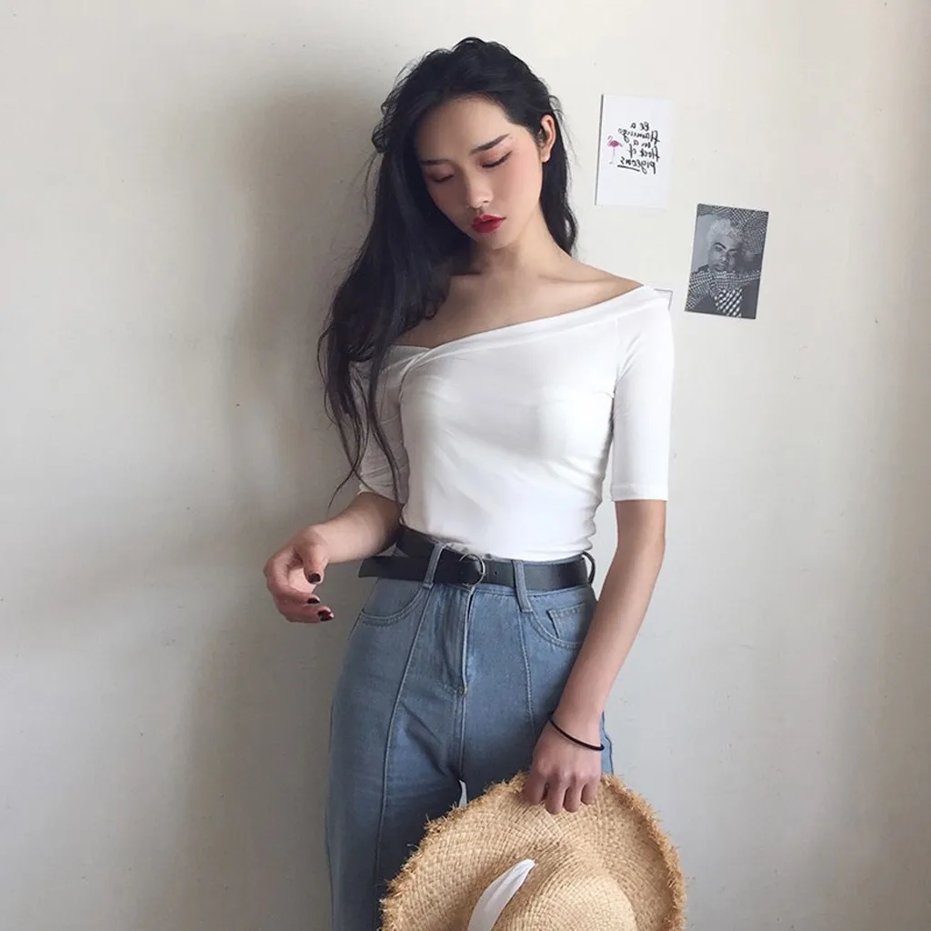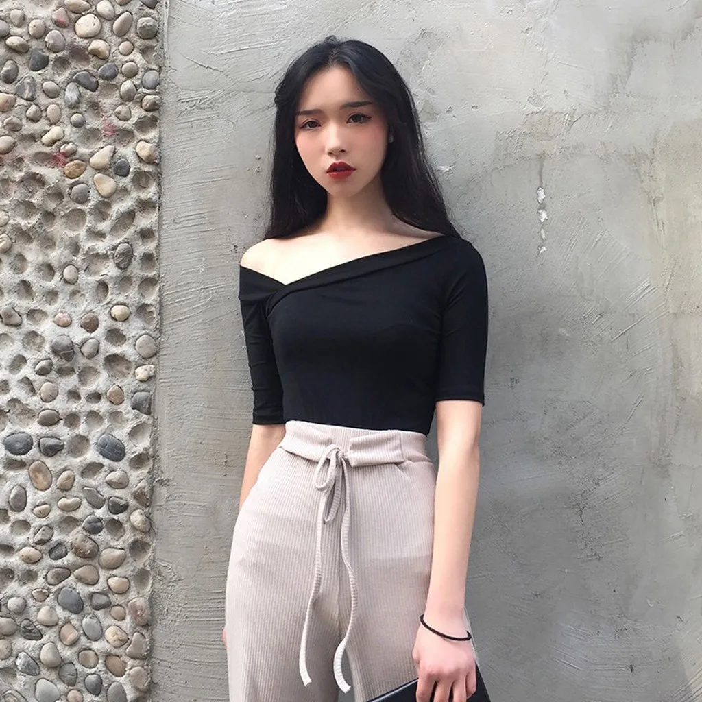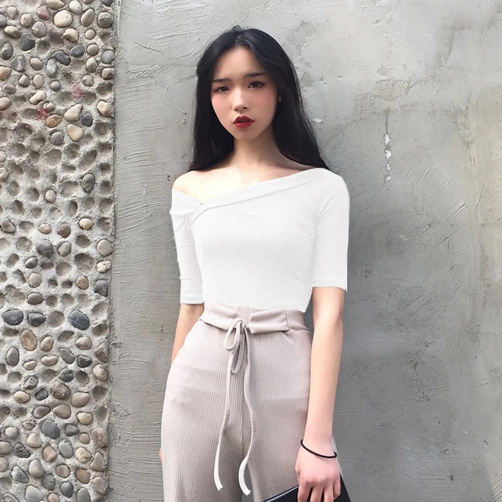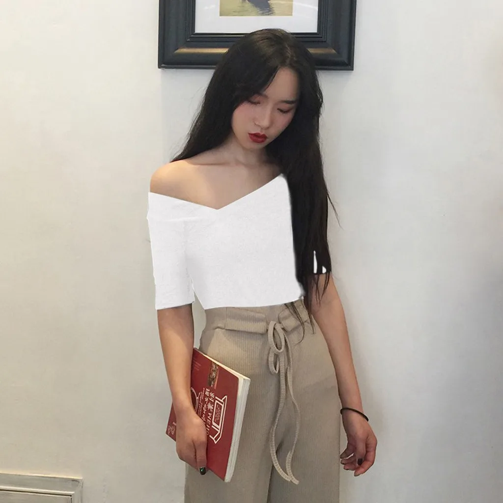 Женская Повседневная с глубоким v-образным вырезом чистый цветС открытыми плечамиРубашки с коротким рукавом, блузка
