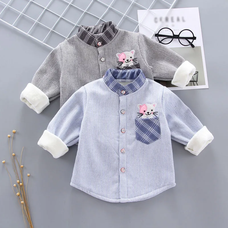 Зимние рубашки для маленьких мальчиков плотные теплые детские топы в полоску с длинными рукавами и рисунком, Повседневная кашемировая блуза От 6 месяцев до 3 лет