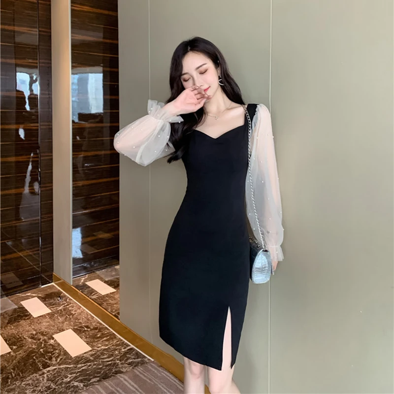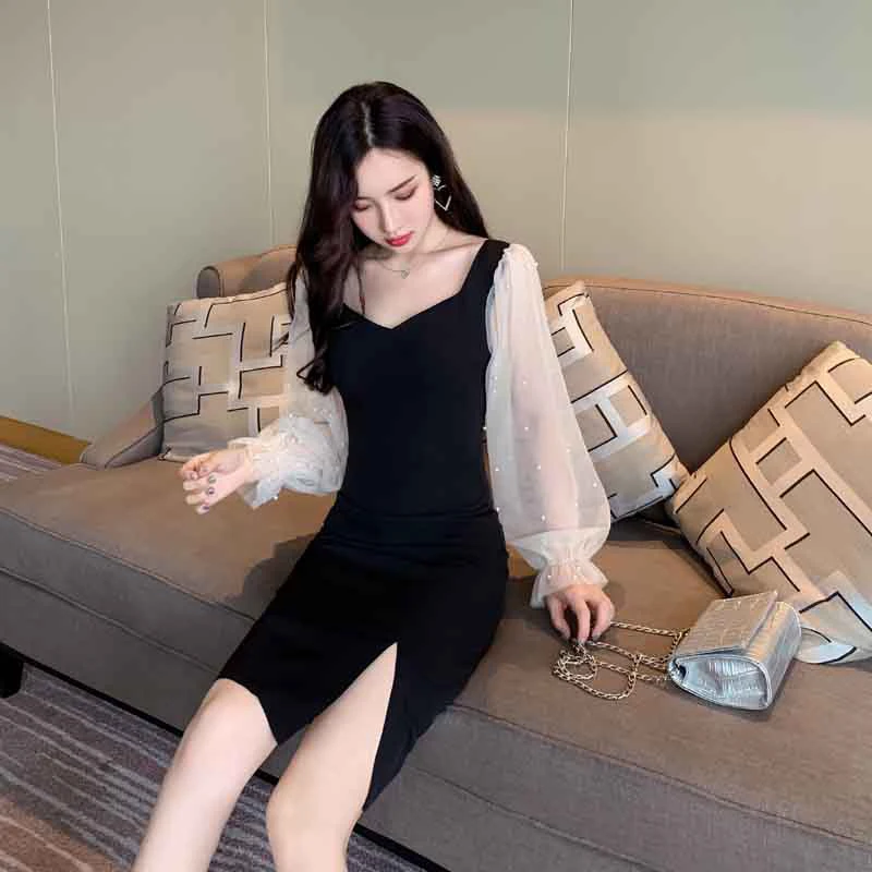 Наименование товара:Женское платье, весна-осень, новинка, женское платье, темперамент, сетка, пэчворк, рукав-фонарик, бисероплетение, высокая талия, разрез, черное платье, ML626