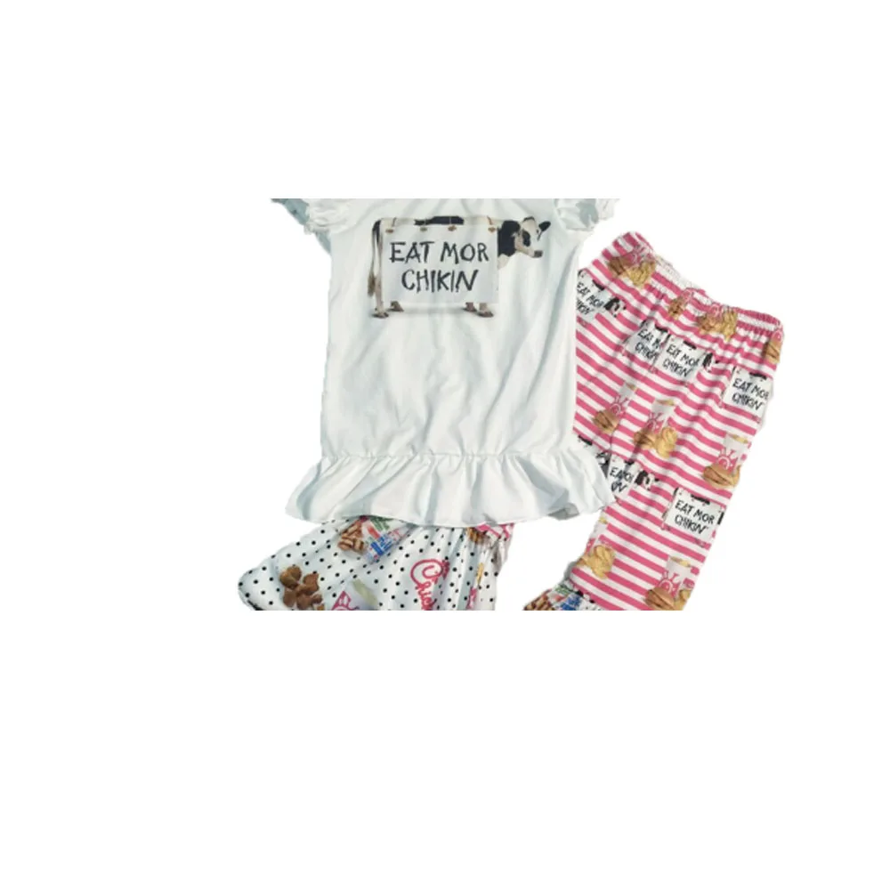 Новое поступление, модная одежда для девочек белый топ с принтом коровы, комплект одежды со штанами с изображением гамбургера