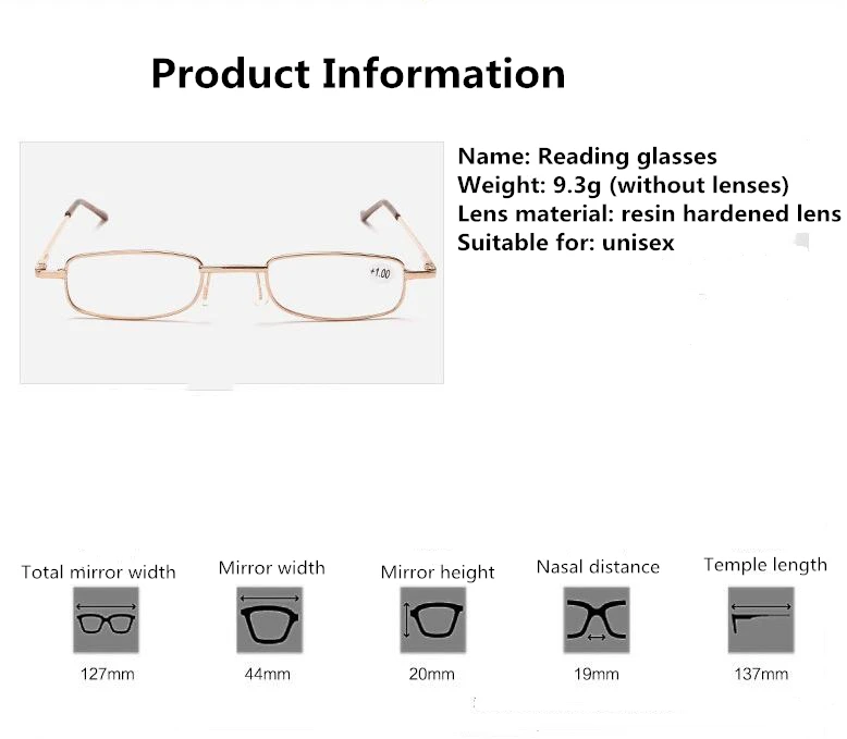 Название: очки для чтения Вес: 9,3 г (без линз) Материал линз: полимерная закаленная линза Подходит для: унисекс