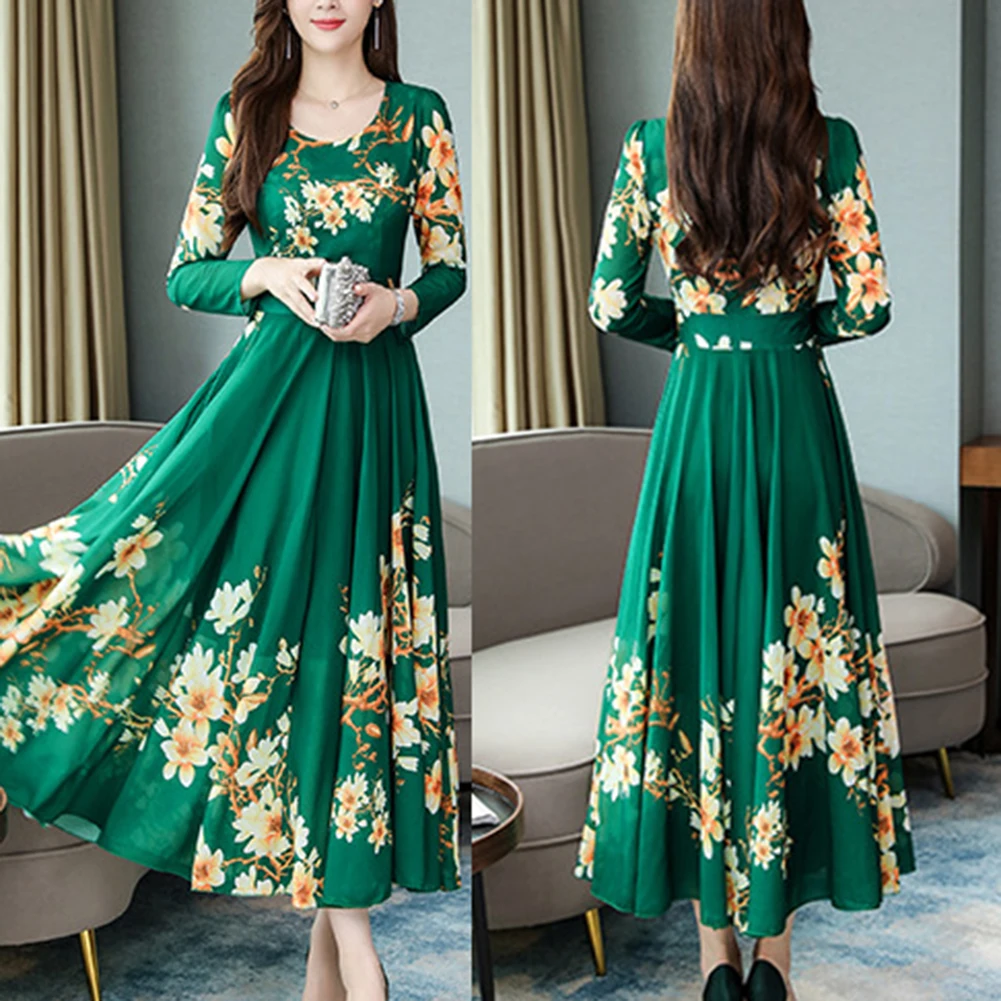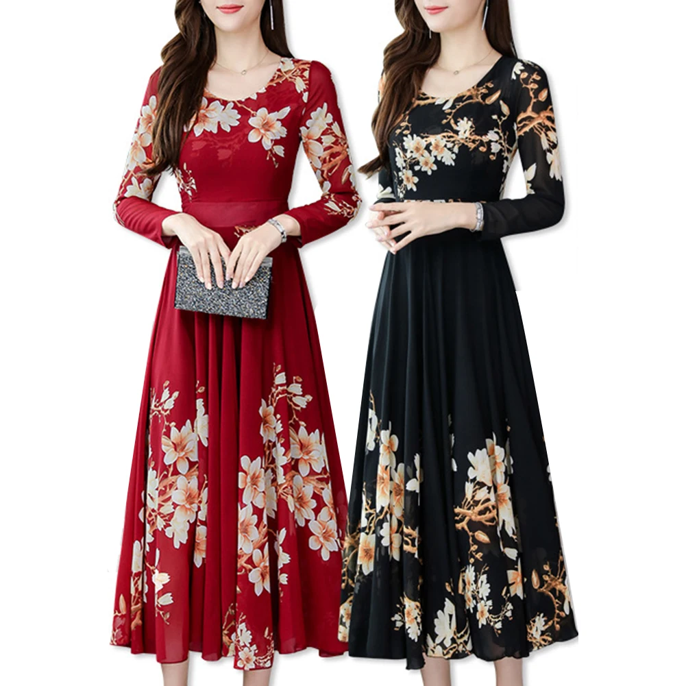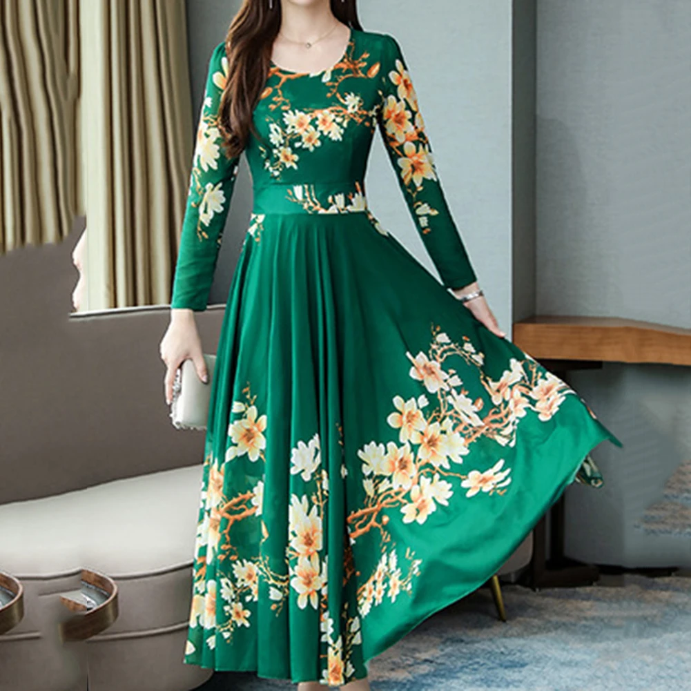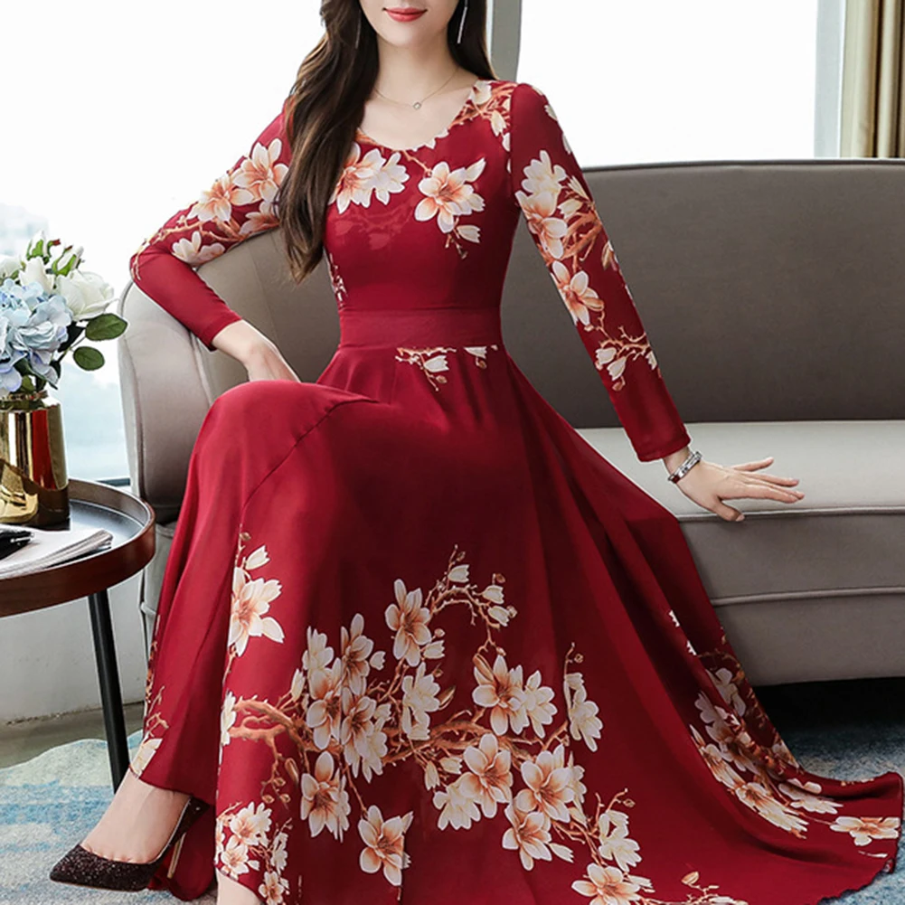 Модное платье размера плюс, женское элегантное платье с круглым вырезом, длинным рукавом, с цветочным принтом, облегающее, большое, свободное, макси платье, вечернее, Осеннее