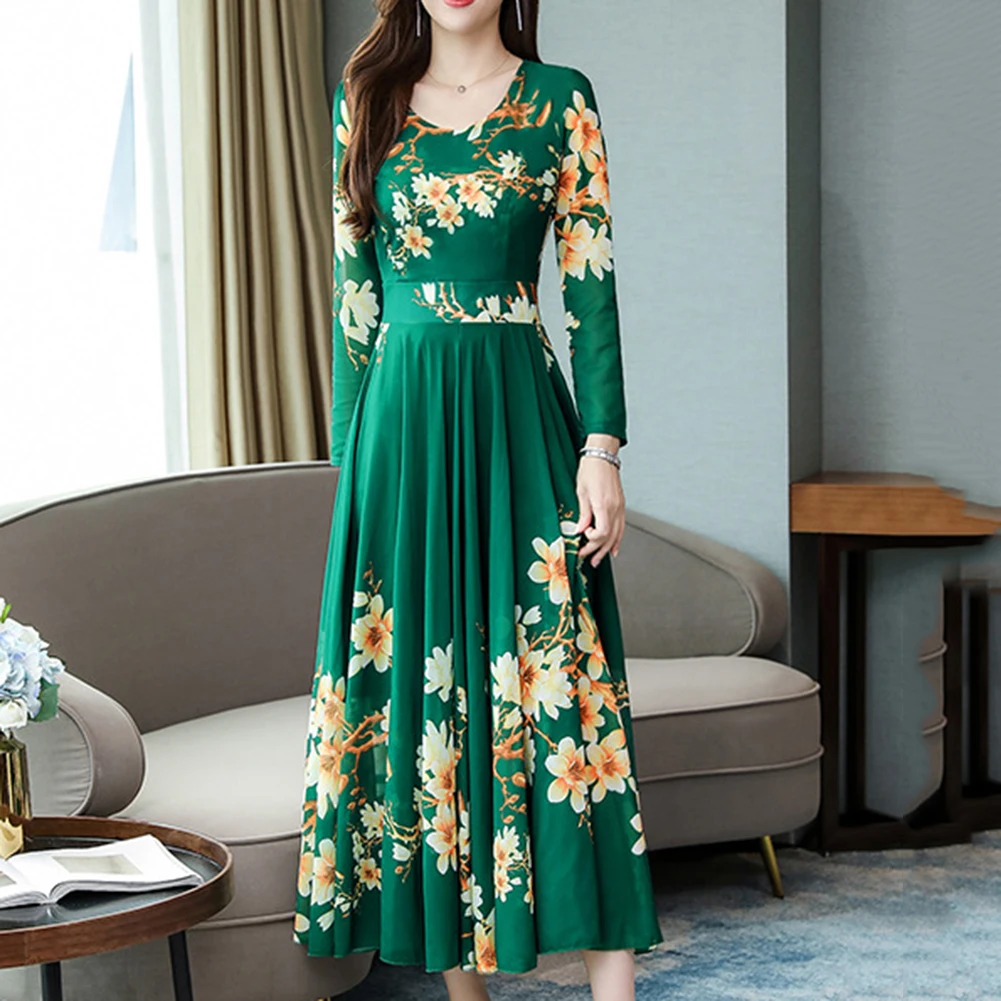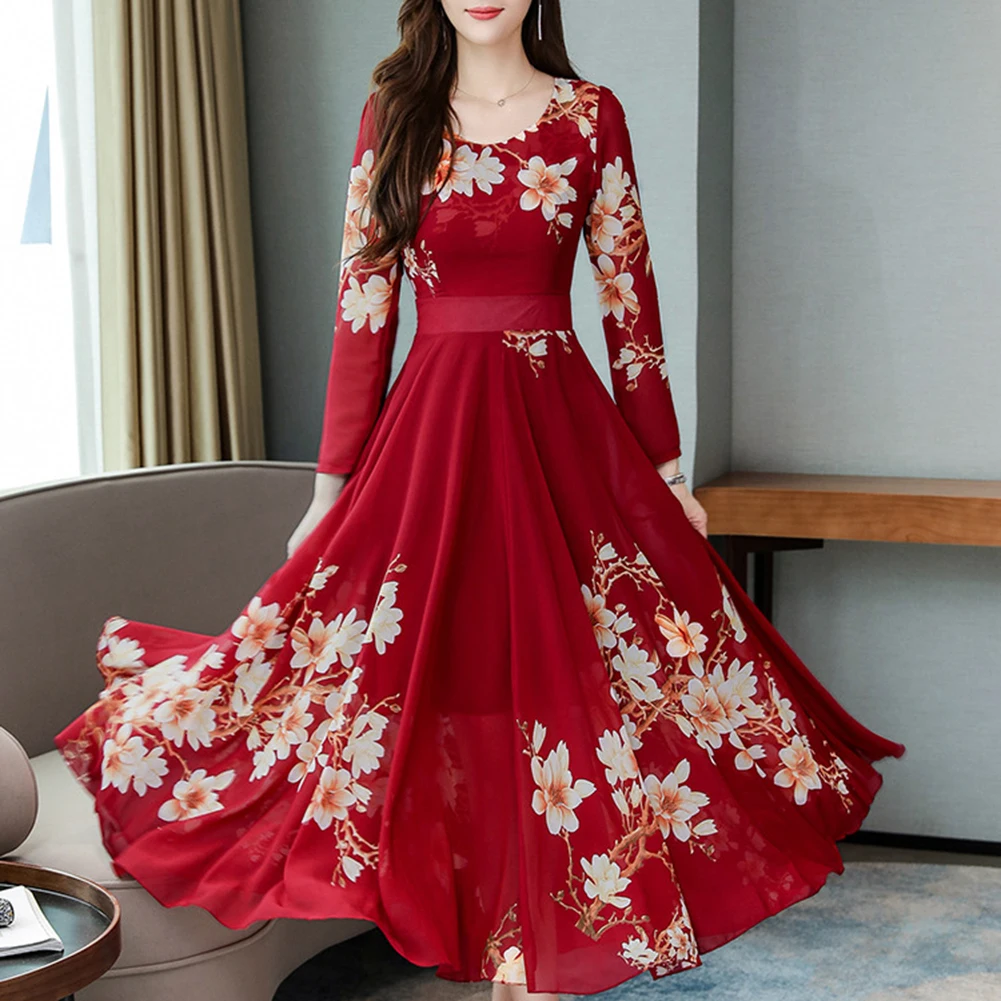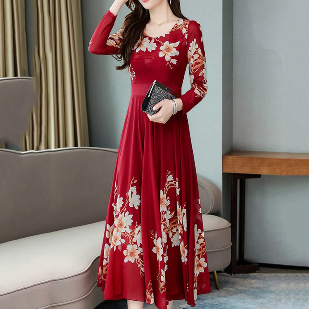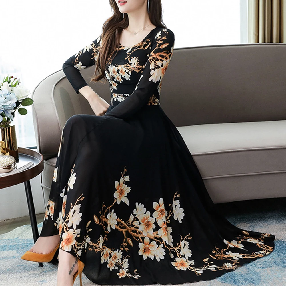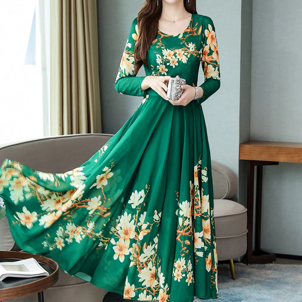 Модное платье размера плюс, женское элегантное платье с круглым вырезом, длинным рукавом, с цветочным принтом, облегающее, большое, свободное, макси платье, вечернее, Осеннее