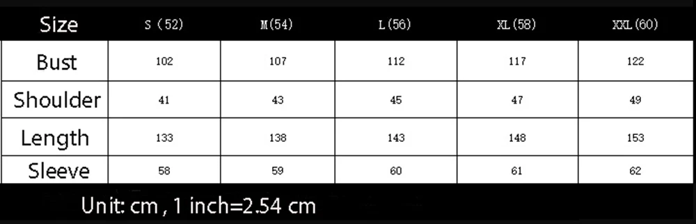 S: ширина плеч 41 см, обхват груди 102 см, длина рукава 58 см, длина 133 см M: ширина плеч 43 см, обхват груди 107 см, длина рукава 59 см, длина 138 см L: Плечо 45 см, обхват груди 112 см, рукав 60 см, длина 143 см XL: ширина плеч 47 см, обхват груди 117 см, длина рукава 61 см, длина 148 см 2XL: плечо 49 см, бюст 122 см, рукав 62 см, длина 153 см