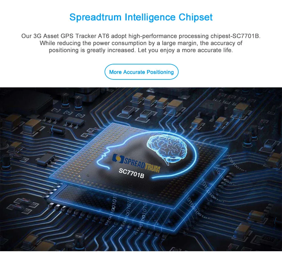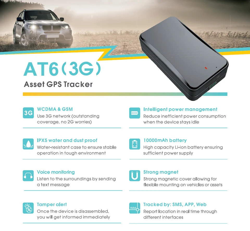 AT6-это GPS Трекер 3G с частотой 850/900/1900/2100 МГц WCDMA и частотой 850/900/1800/1900 МГц GSM. Он оснащен литий-ионным аккумулятором высокой мощности, который может работать от 7 недель до 2 лет в зависимости от интервала отображения местоположения. Магнитный и водонепроницаемый корпус позволяет AT6 легко и незаметно помещаться внутри или под транспортным средством или другим активом.