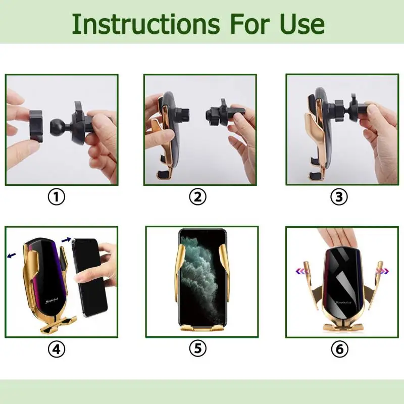 -Как использовать, автомобильное зарядное устройство будет раскрываться, когда ваша рука и ваше тело близки к нему. Если телефон не включен, он закроется. И он будет автоматически зажимать, когда вы поместите телефон на него. Коснитесь верхней части задней крышки, чтобы открыть ее автоматической индукцией. (Примечание: поскольку беспроводное автомобильное зарядное устройство является полностью автоматической индукцией, если оно плотно прилегает к беспроводному автомобильному зарядному устройству, оно будет автоматически открываться и закрываться, это нормальная реакция, пожалуйста, избегайте как можно больше приближения к индукционной области.